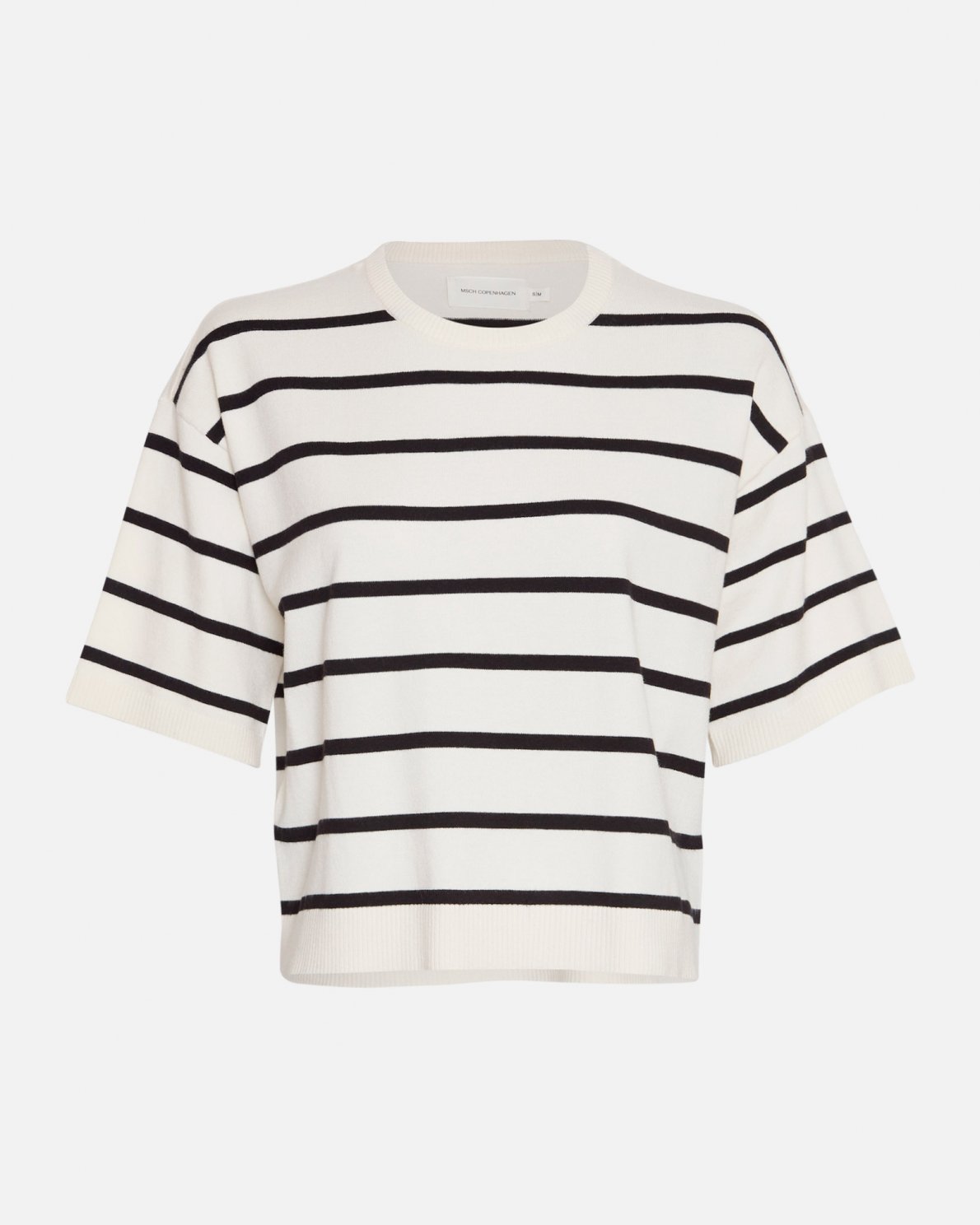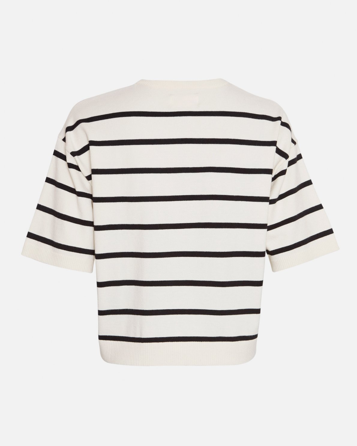 Let, kortærmet pullover med vandrette striber i blødt materiale. Det er en blød strik pullover, som kan være et stærkt fundament for en alsidig garderobe, da den kan styles på mange måder. Kombiner denne fin strik med dine go-to jeans, en let feminine sommernederdel eller elegante bukser.