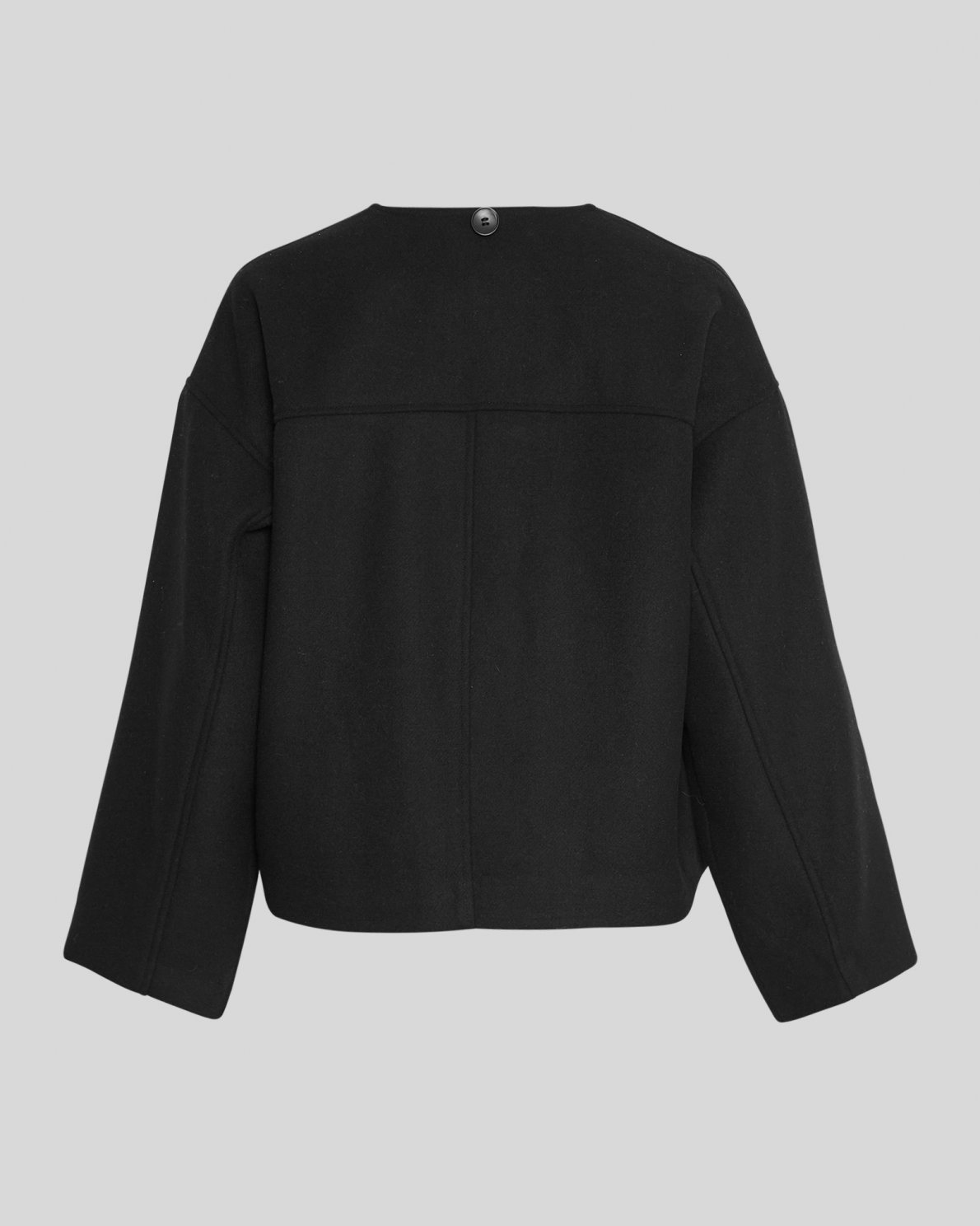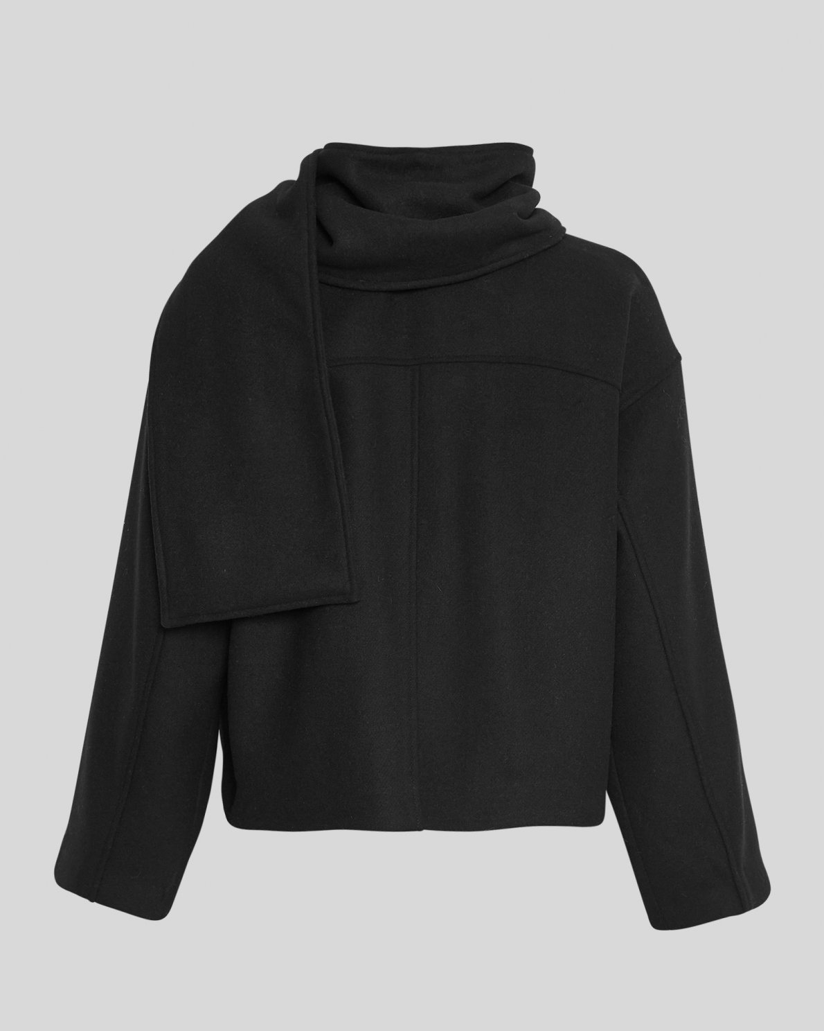 En kort uldjakke, med et tørklæde du kan hæfte på eller tage af som det passer dig. Foruden halstørklædet har jakken en v-udskæring og en knappelukning foran. Tørklædet bliver sat fast i nakken med knap også.