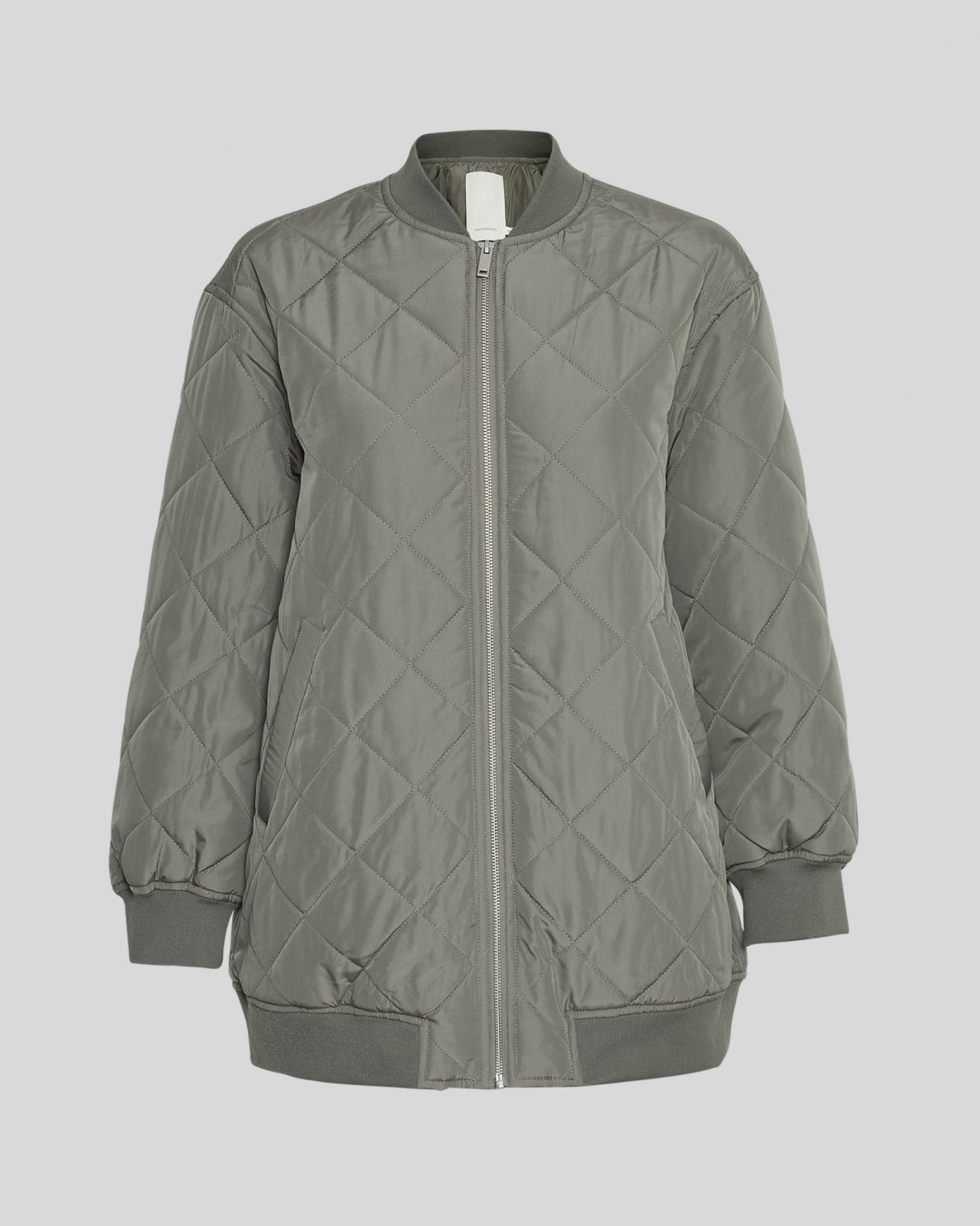 Denne jakke er en kombination af en klassisk quiltet jakke og en bomber jakke. Den har en løs pasform med elastikkant både omkring halsudskæringen som en krave lignende feature, i bunden og i håndleddene. Jakken har lynlåslukning og sidelommer.