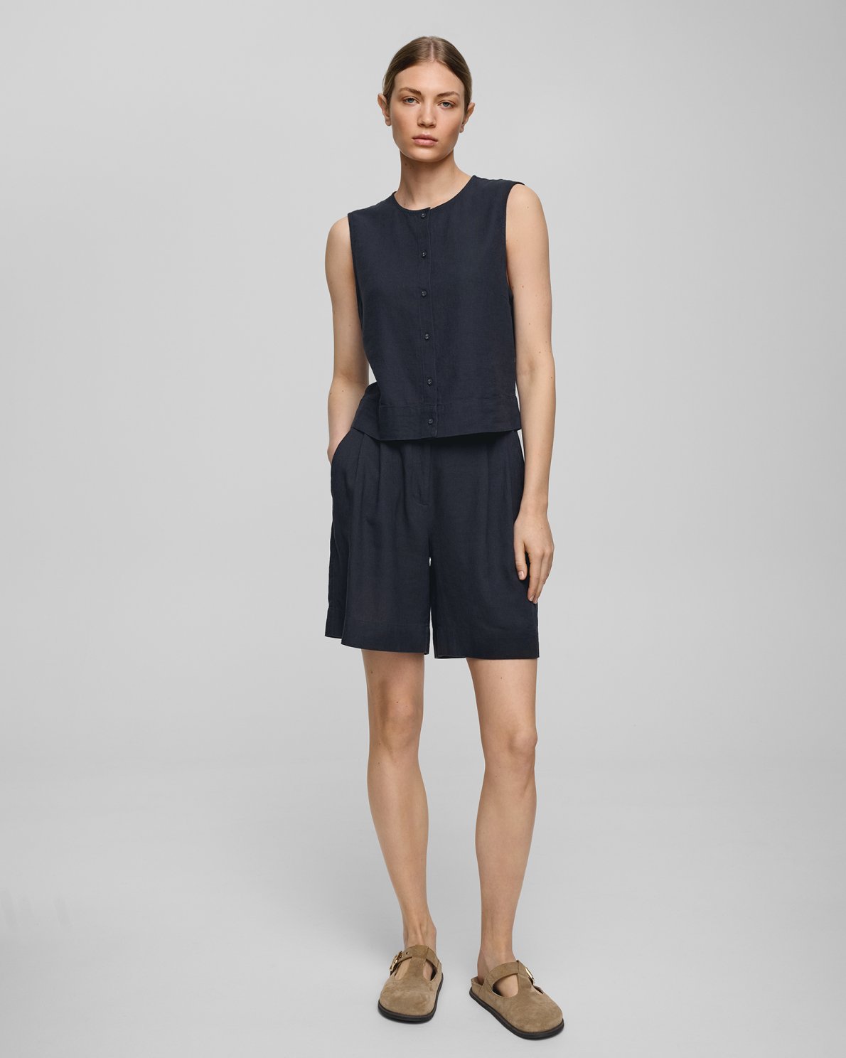 Pennie-kollektionen er en serie af produkter fremstillet af hør og bomuld, designet til at være dine go-to styles til sommeren. De har lette og luftige materiale, og de er nemme at mix and matche, som du vil. Shortsene har elastik i taljen, baglommer, knaplukning, samt pressefolder foran.