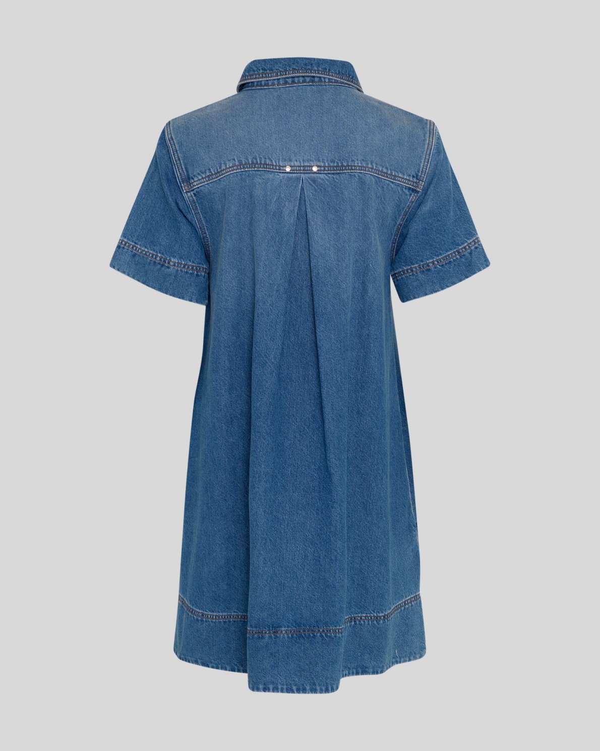 Kortærmet denimkjole i midi længde med klassisk krave og knaplukning ved halsen. Kjolen har en let A-formet silhuet med fald fra brystet og dekorative syninger. Fremstillet i 100 % certificeret bomuld.