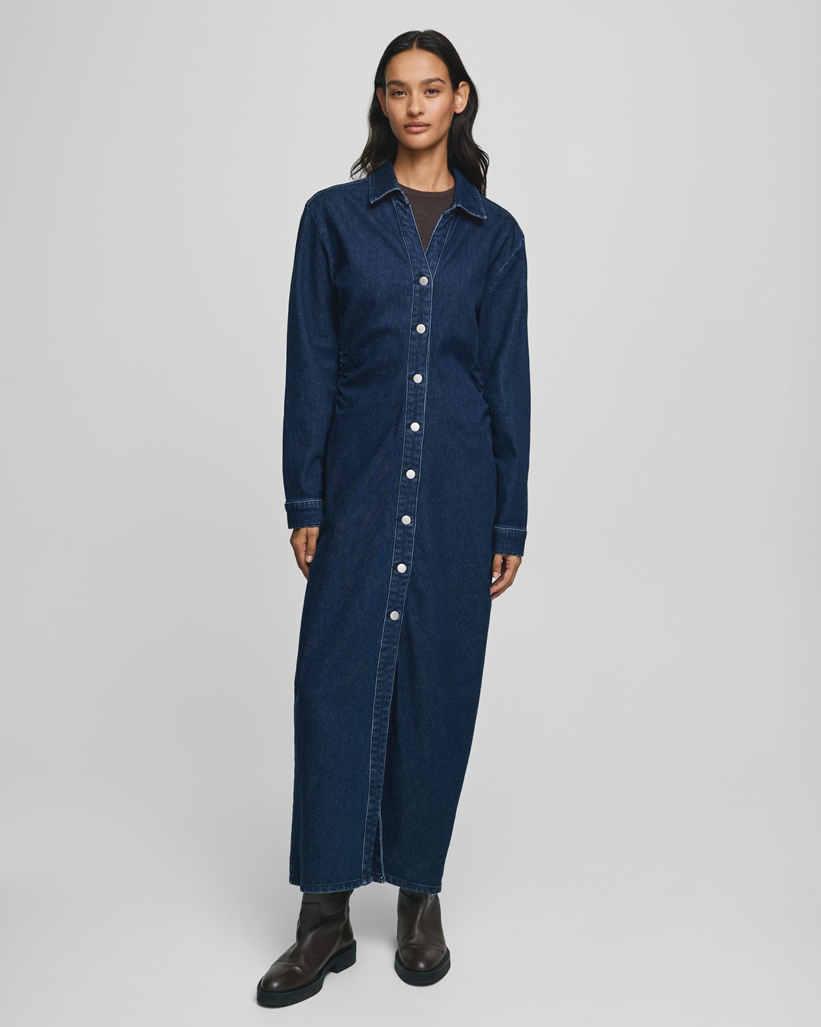 MSCH Mow Shirt Dress er en lang denimkjole med klassisk skjortekrave og gennemgående knaplukning foran. Den lange silhuet kombineret med de markerede syninger giver et tidløst og stilrent look, der kan styles både til hverdag og mere festlige lejligheder. Brug den med sneakers for et afslappet outfit eller med støvler og accessories for et mere sofistikeret udtryk.