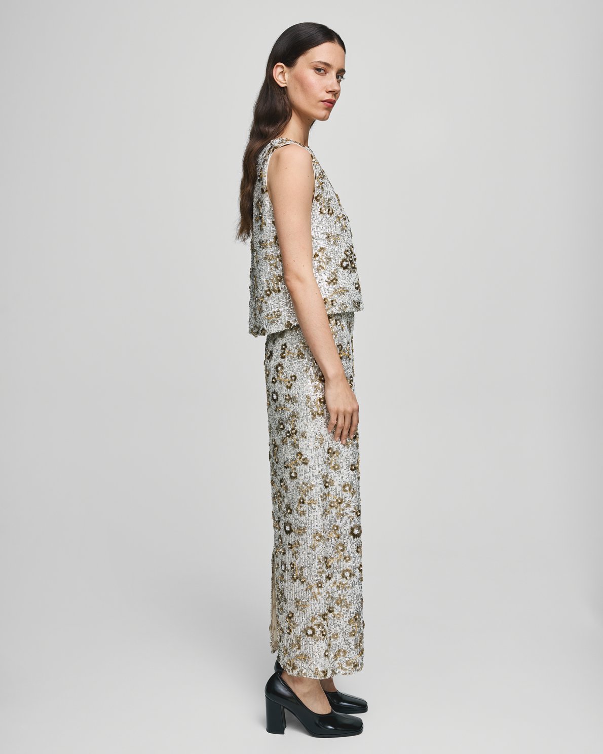 MSCH Magnolia SL Top EMB er en elegant tilføjelse til din garderobe med et strejf af glimmer. Den smukke kombination af sølv og choko-nuance fremhæver toppens skinnende look og giver et sofistikeret udtryk. Med dens ærmeløse design og  flatterende pasform er den perfekt både alene og under en blazer eller strik. Magnolia SL Top EMB er mere end bare en top – den er et stilfuldt statement, der løfter både festlige outfits og hverdagslooks.