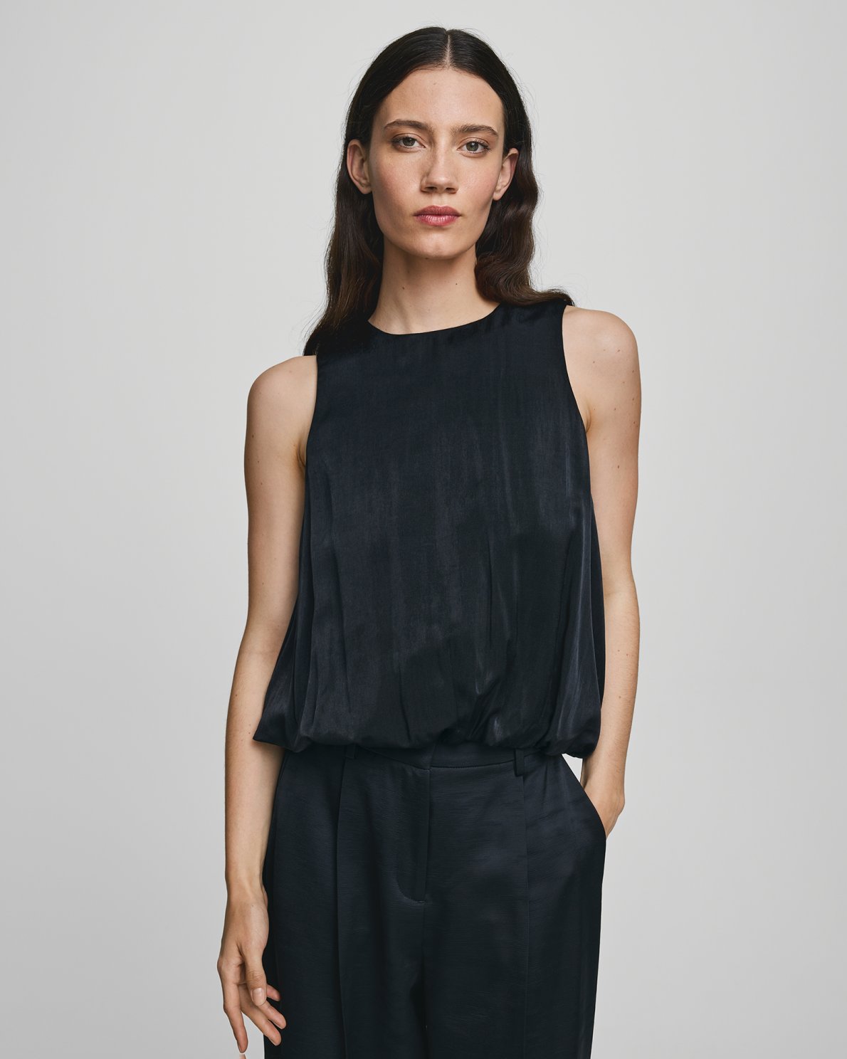 MSCH Ofelia Nicholina SL Top er en stilfuld ærmeløs top med rund hals og let skinnende finish, der giver et sofistikeret udtryk. Den diskrete elastiske kant forneden skaber en elegant silhuet, som gør toppen velegnet både til hverdag og fest. I klassisk sort er den nem at style med alt fra jeans til elegante bukser eller nederdele.