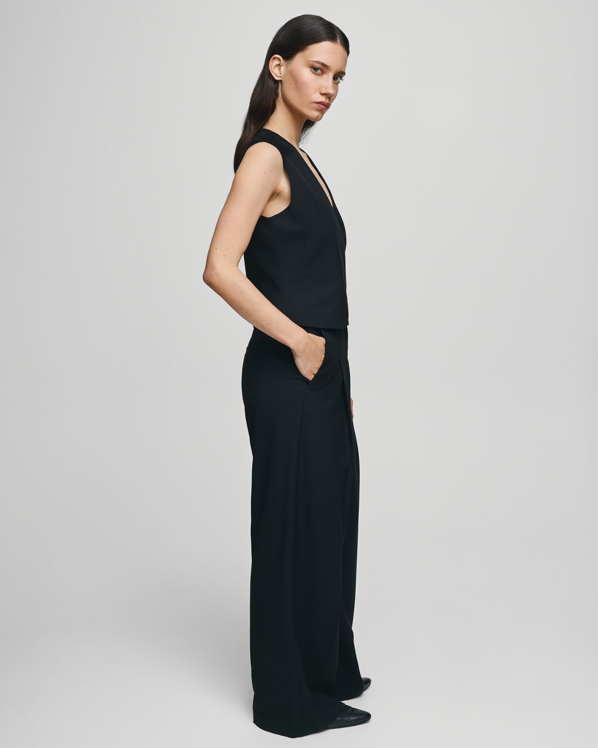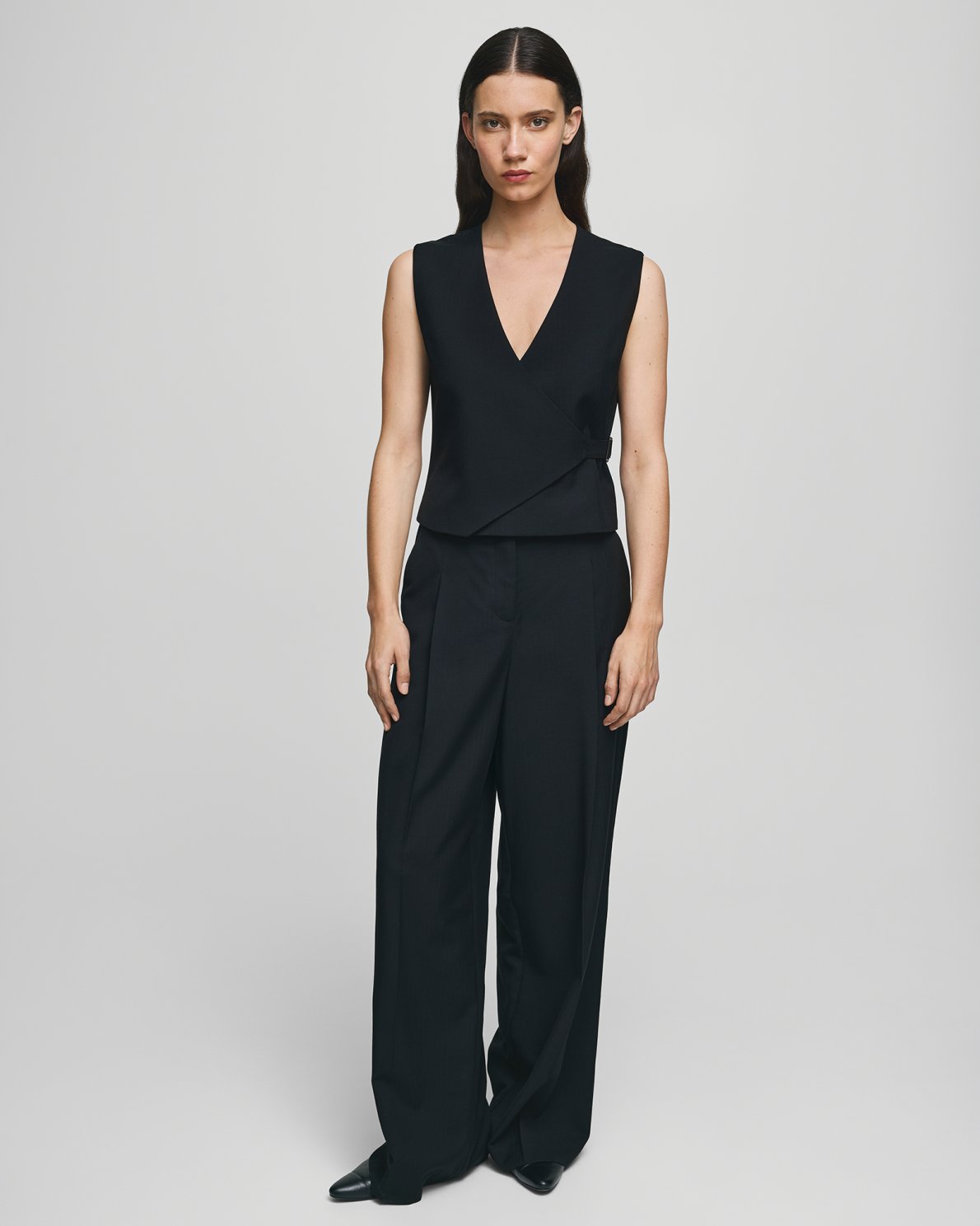 Machella er en klassisk sort habitbuks, med høj talje og lommer. Buksebenene er i et lige fit. Modellen er 173cm og bruger en størrelse S.