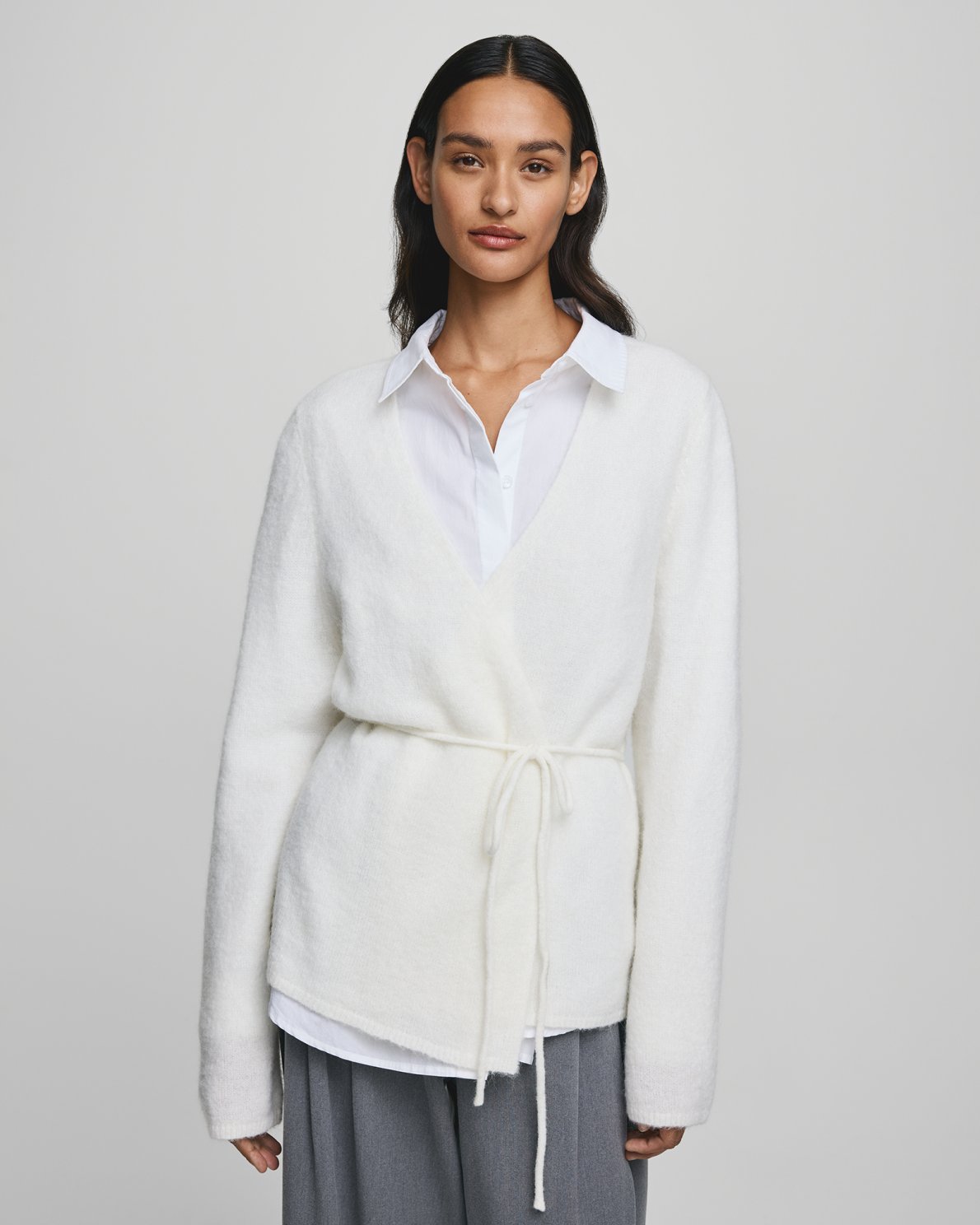 Denne cardigan har en løs pasform, men som kan justeres med et strikkede bælte i taljen. Wrappen kreerer en v-udskæring, samt cardiganen har lange ærmer.