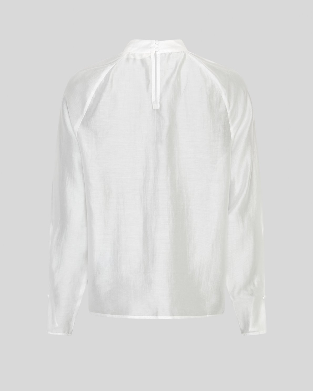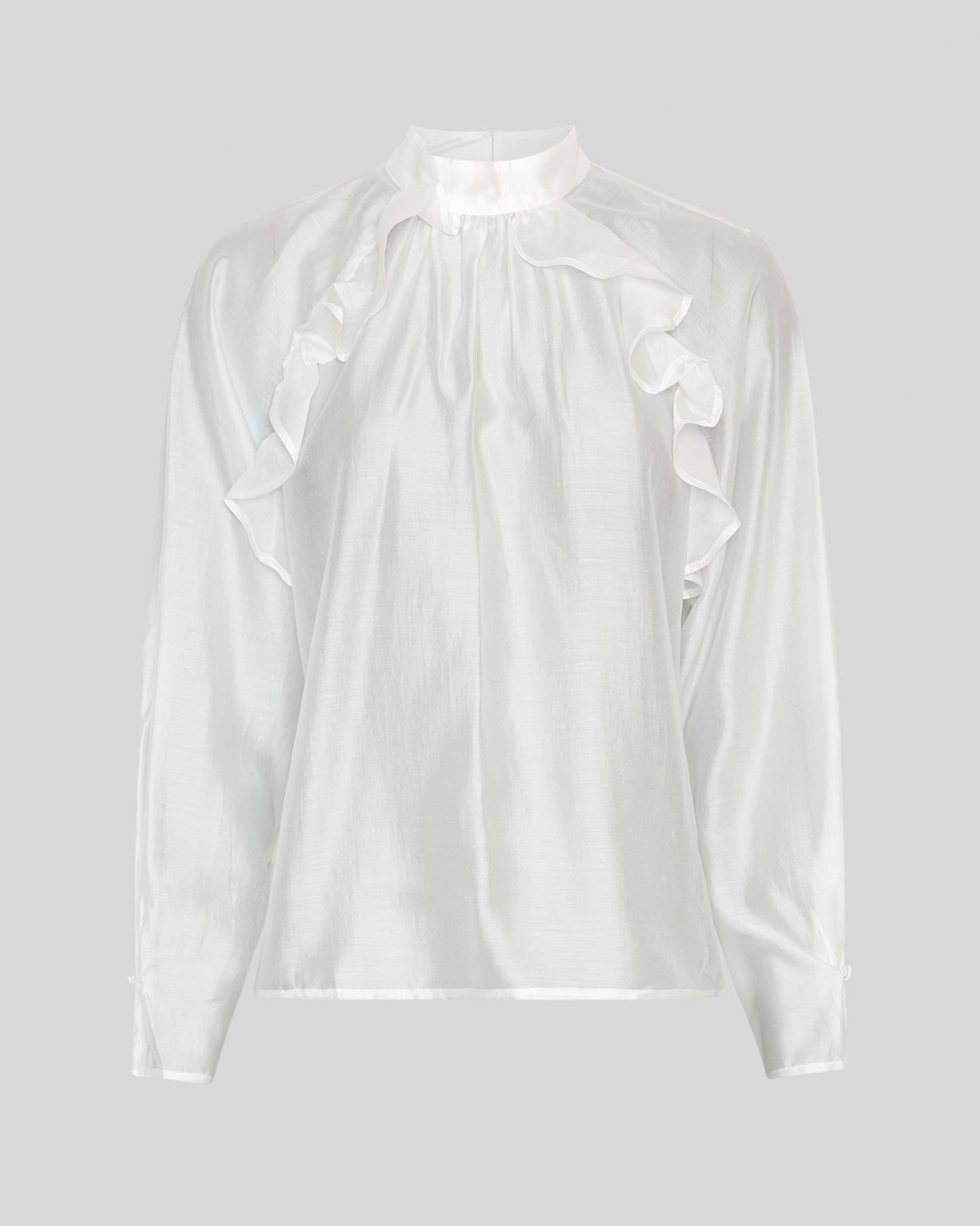 Denne top har en boxy pasform, med dens løse samt korte fit. Toppen har et langærmet og højhalset design, med knappelukning i nakken. Der er tilføjet en flæserække ved skuldrene og en knap ved håndledet for at give toppen et feminint pust. Materialet er meget tyndt og fint, og vil derfor være en anelse gennemsigtig. Vi anbefaler at style den med vores beige Betrina Strap Top, hvis man ikke ønsker den skal være gennemsigtig.