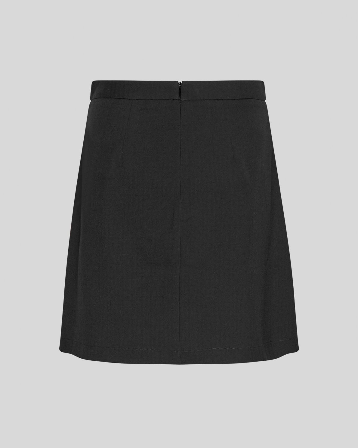 Denne nederdel har en almindelig pasform med en lille A-facon. Modellen er 173cm og bruger en S. Nederdelen er en klassisk, sort mini nederdel med et højtaljet design og en lynlås bagi. Materialet har en sart stribe som mønster.