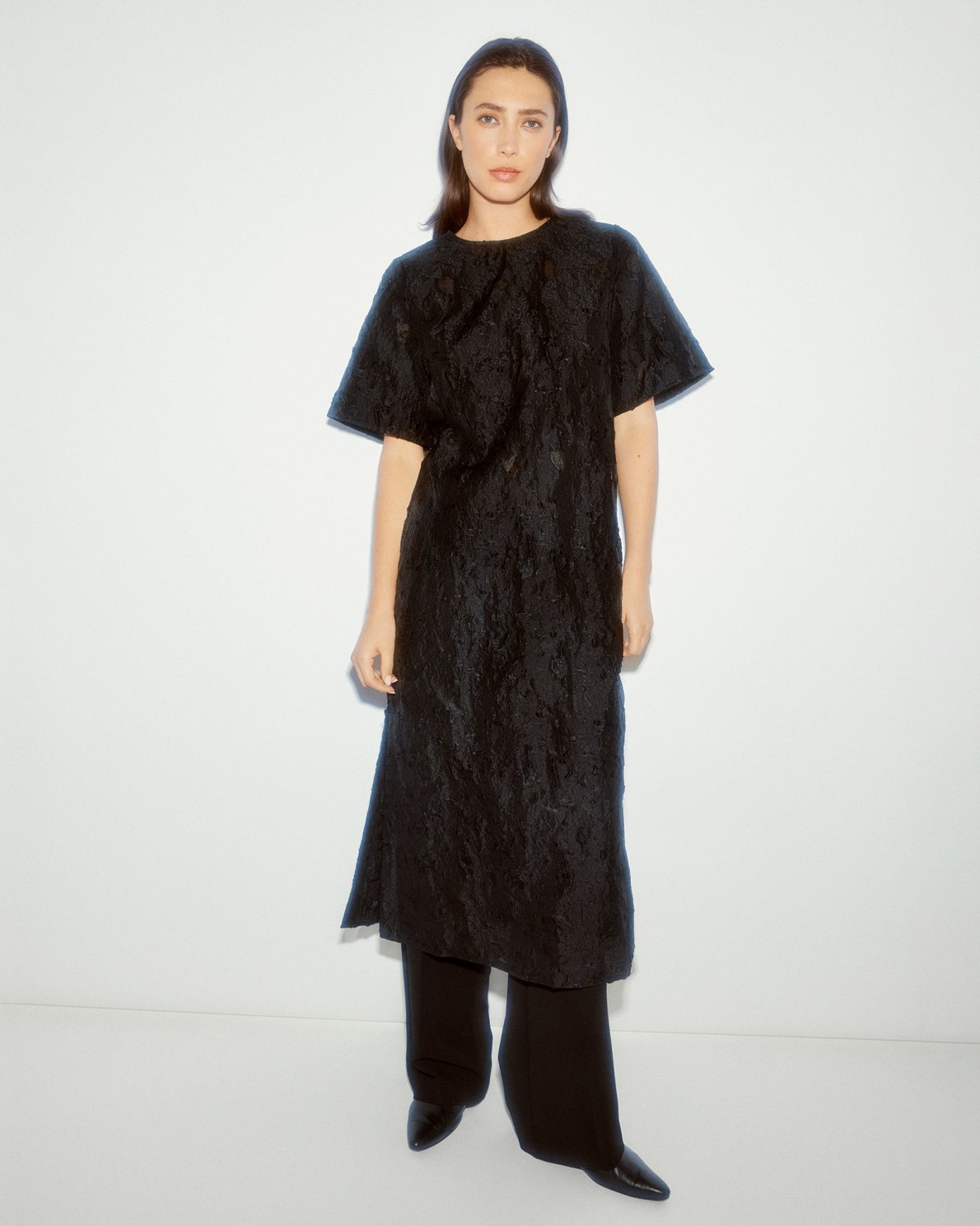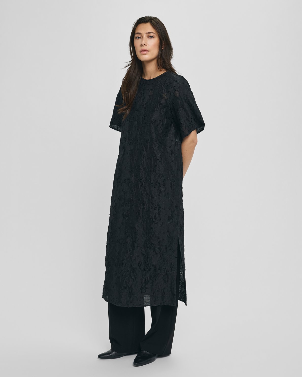 MSCHLakshmi 2/4 Dress er en elegant, ankellang kjole i struktureret, let skinnende materiale. Designet har rund hals som lukkes med en lille knap, korte ærmer og en lige silhuet, der falder naturligt langs kroppen. Den diskrete tekstur giver kjolen et eksklusivt udtryk.