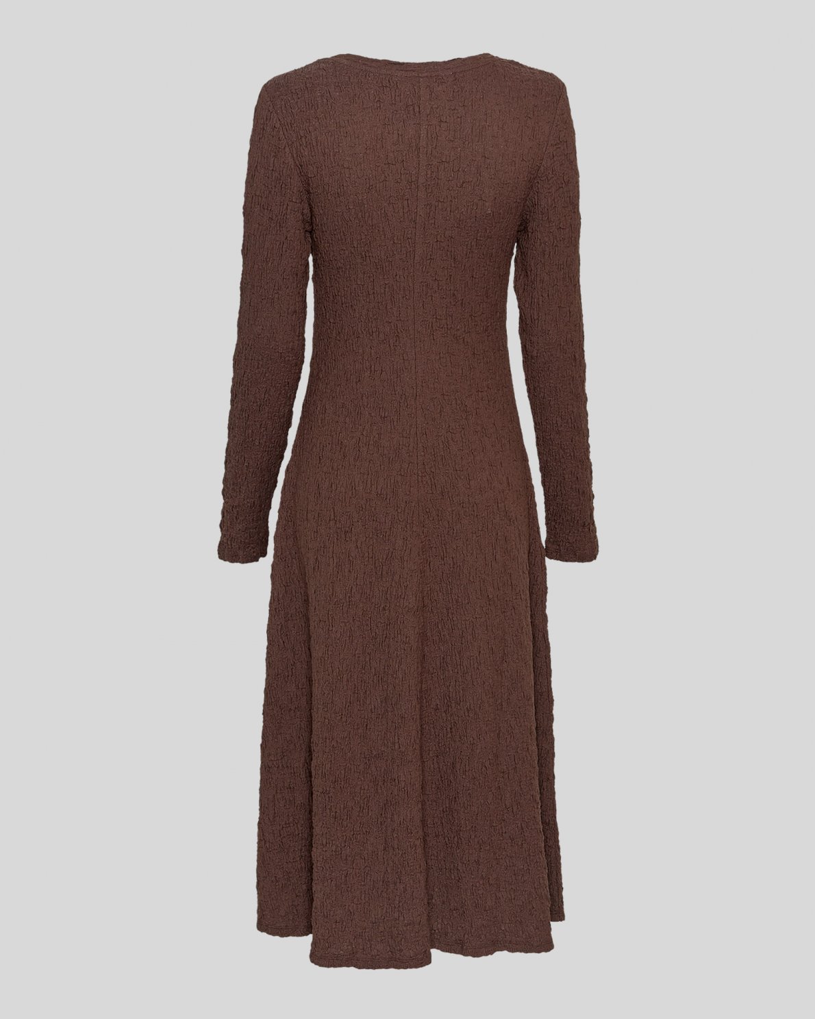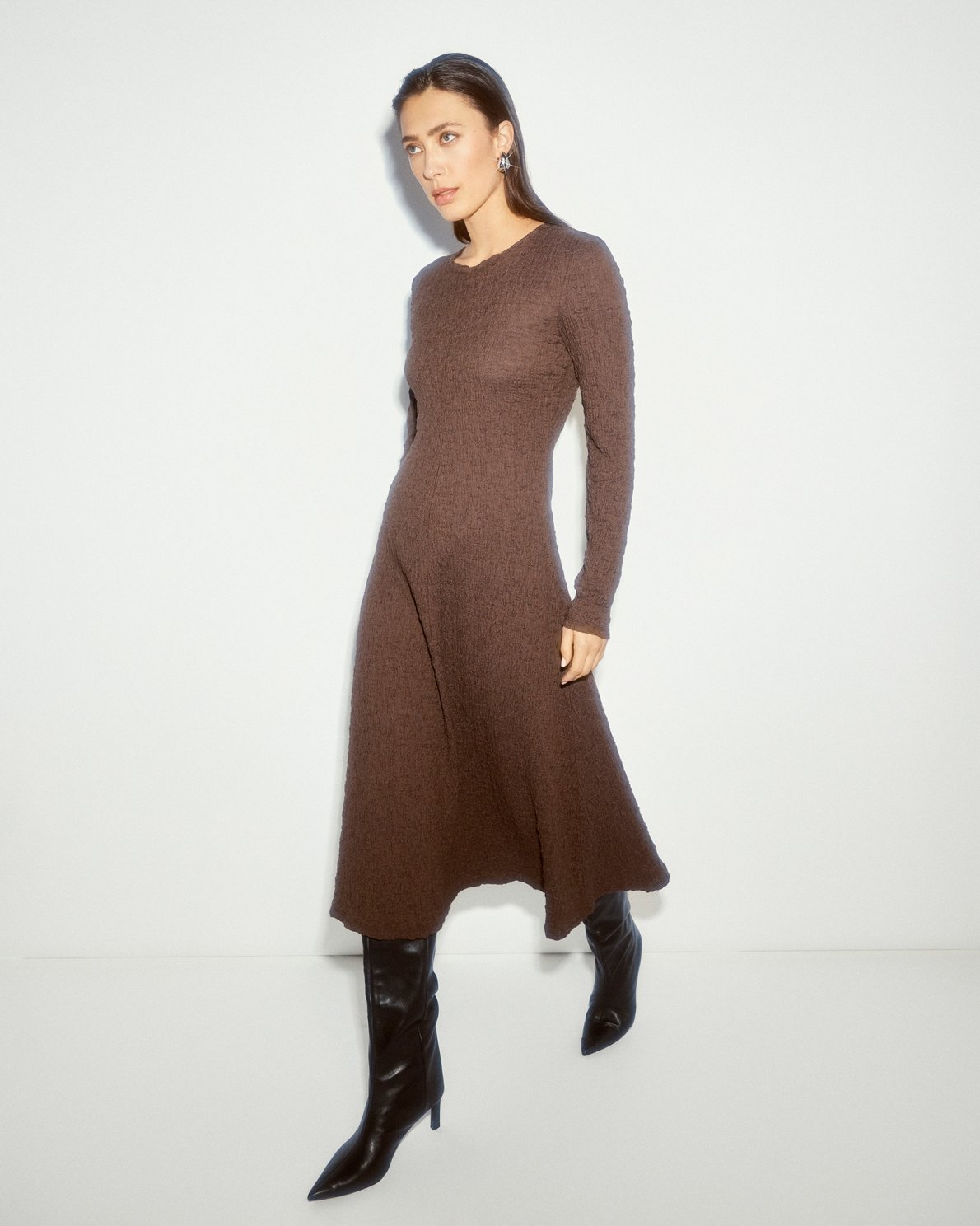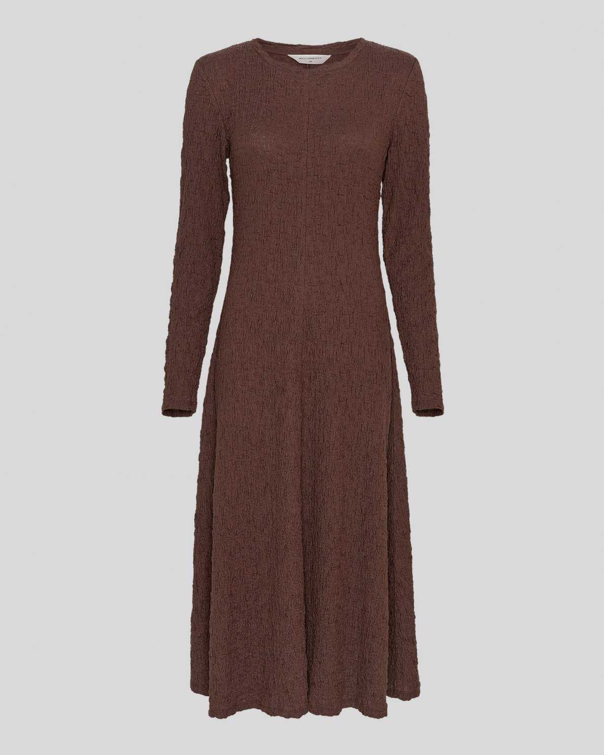 MSCHPayton er en strikket kjole, i en A-facon, der både har et mønster og tekstur i materialet. Kjolen er lang, med en tætsiddende pasform for oven og løsere i skørtet.