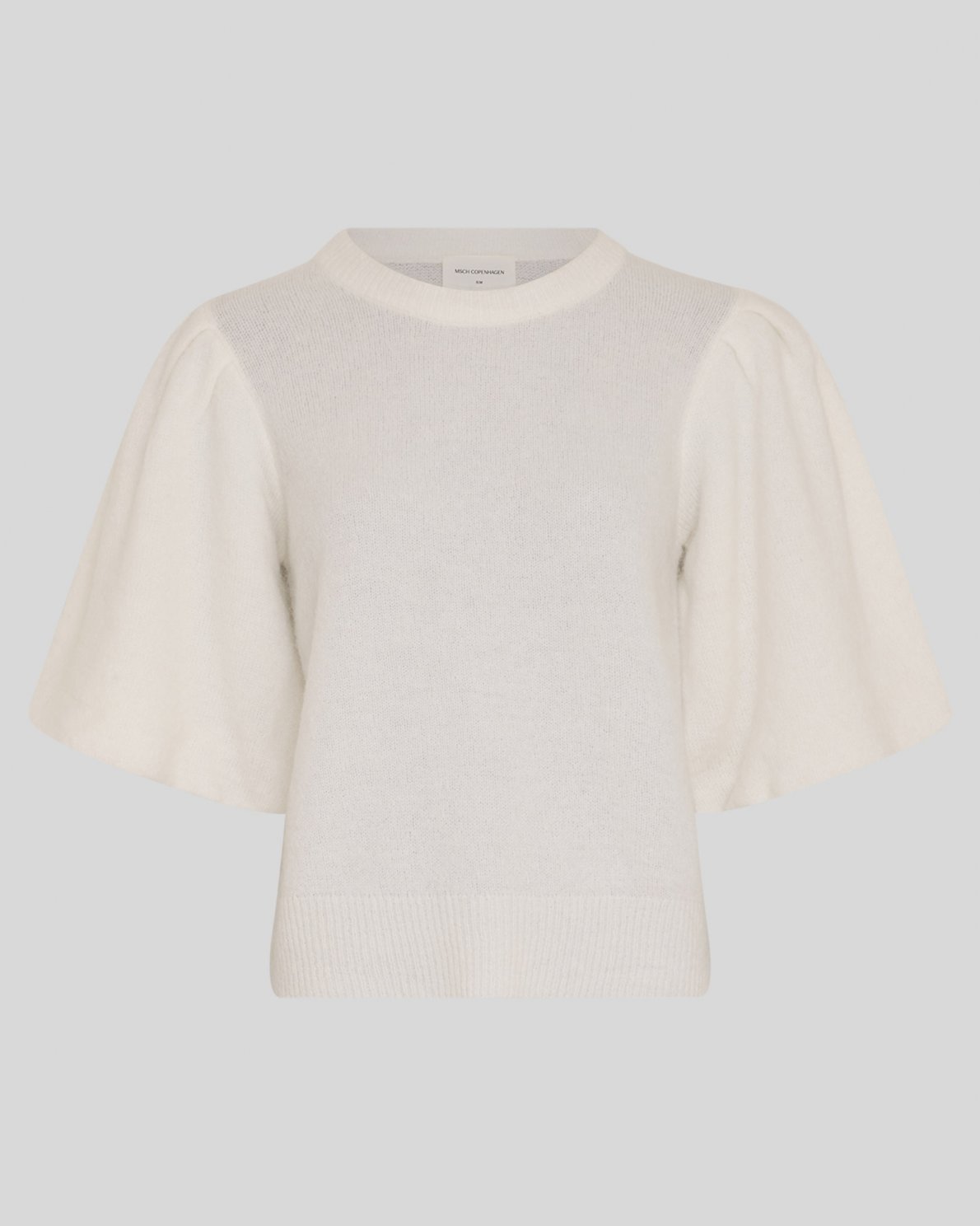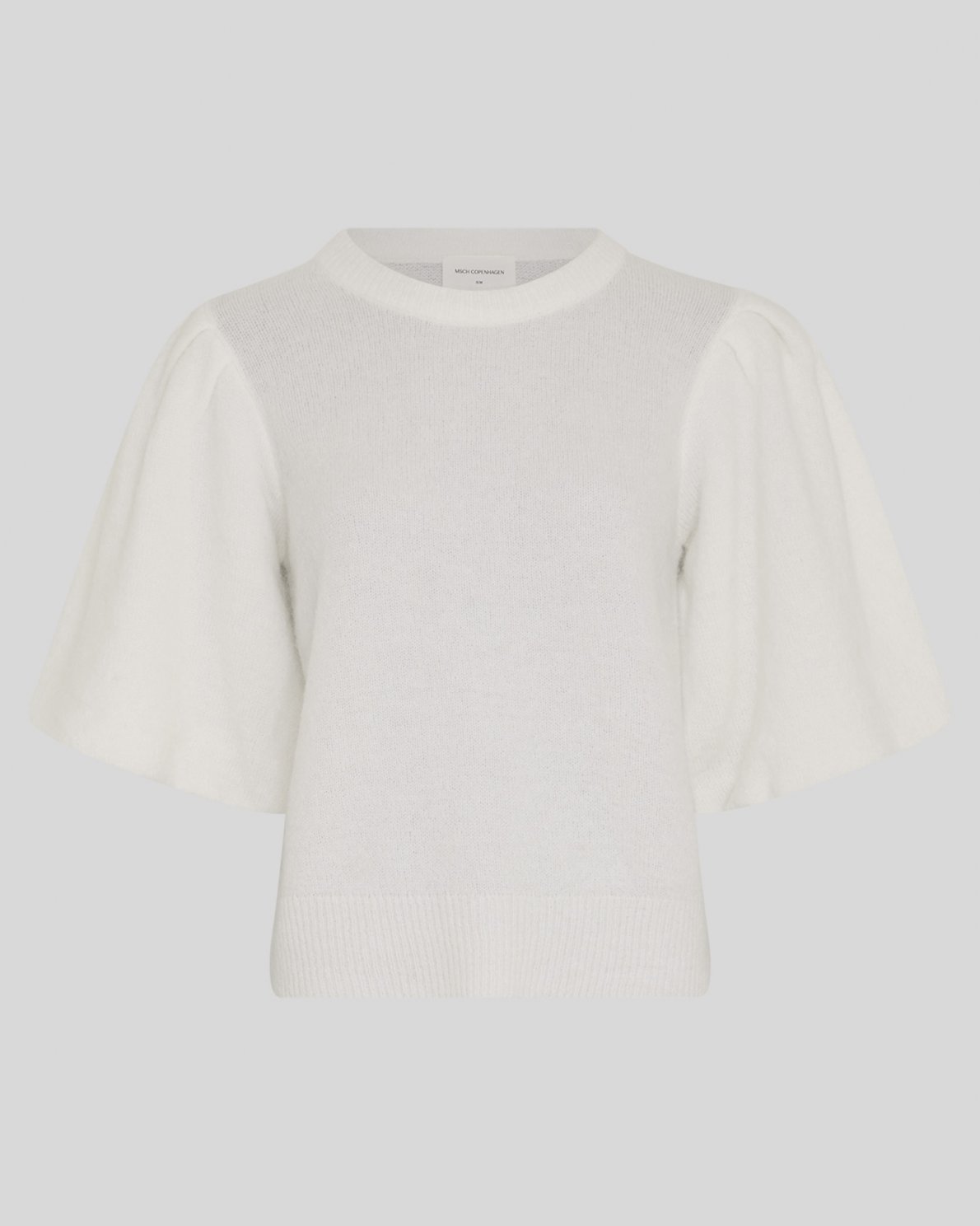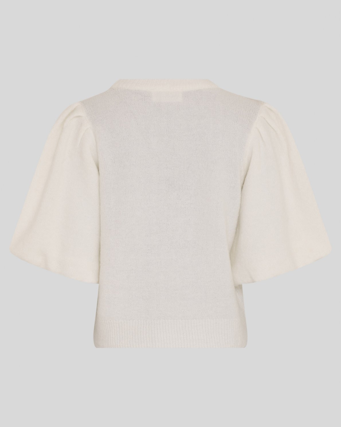 Strikket pullover med rund hals og korte puffede ærmer. Modellen har en blød og let struktur, ribkant ved hals, ærmer og bund, som giver et feminint og afslappet udtryk.
