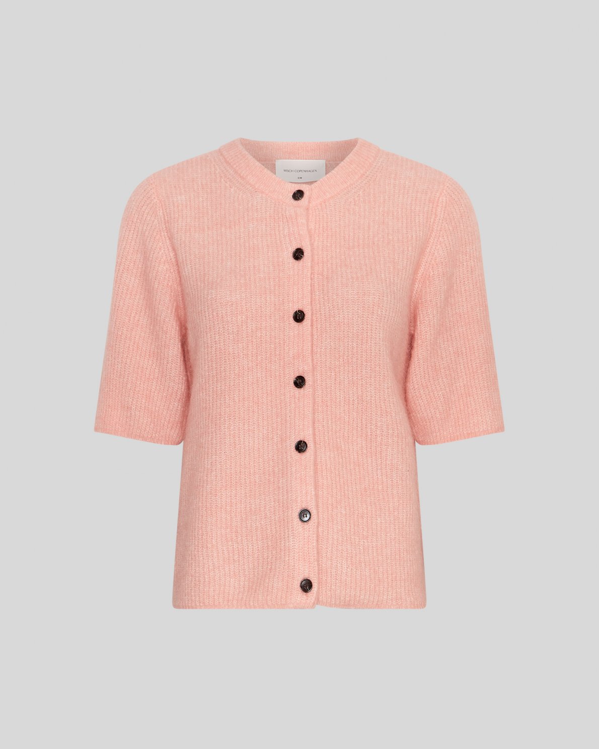 Strikket cardigan med rund hals og gennemgående knaplukning. Modellen har korte ærmer og en let struktureret strik med ribkanter.