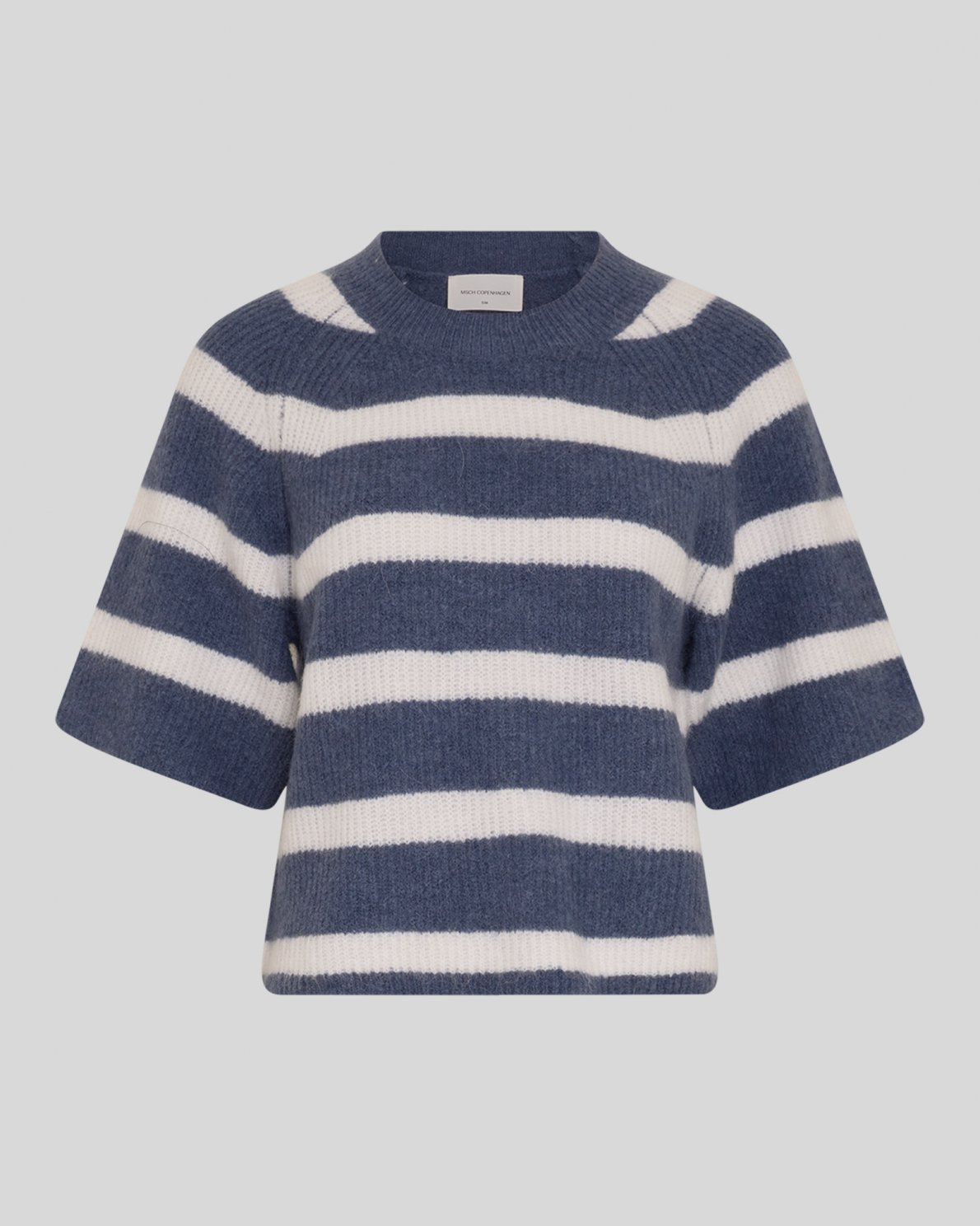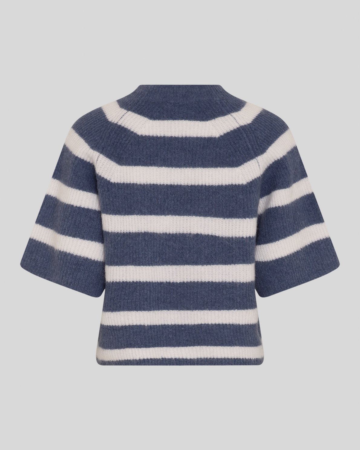 Denne kortærmede strikpullover har et afslappet og moderne udtryk med brede, horisontale striber. Den bløde og lette strikkvalitet giver et behageligt fald, mens materialeblandingen tilfører både varme og struktur.