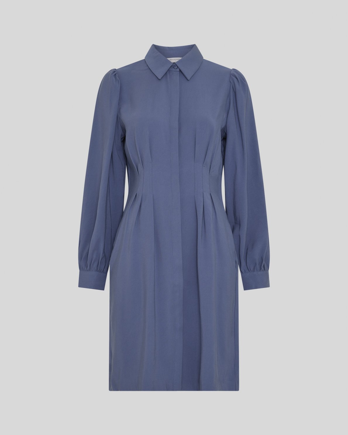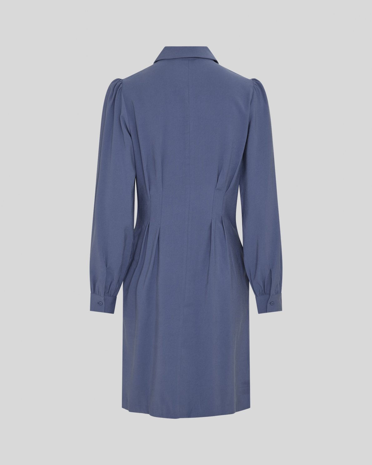 Kjole med klassisk krave, skjult knaplukning foran og markeret talje med indsnit. Modellen har lange ærmer med let volumen ved skuldrene og manchetter med knap. Designet giver en feminin silhuet med let A-formet nederdel.