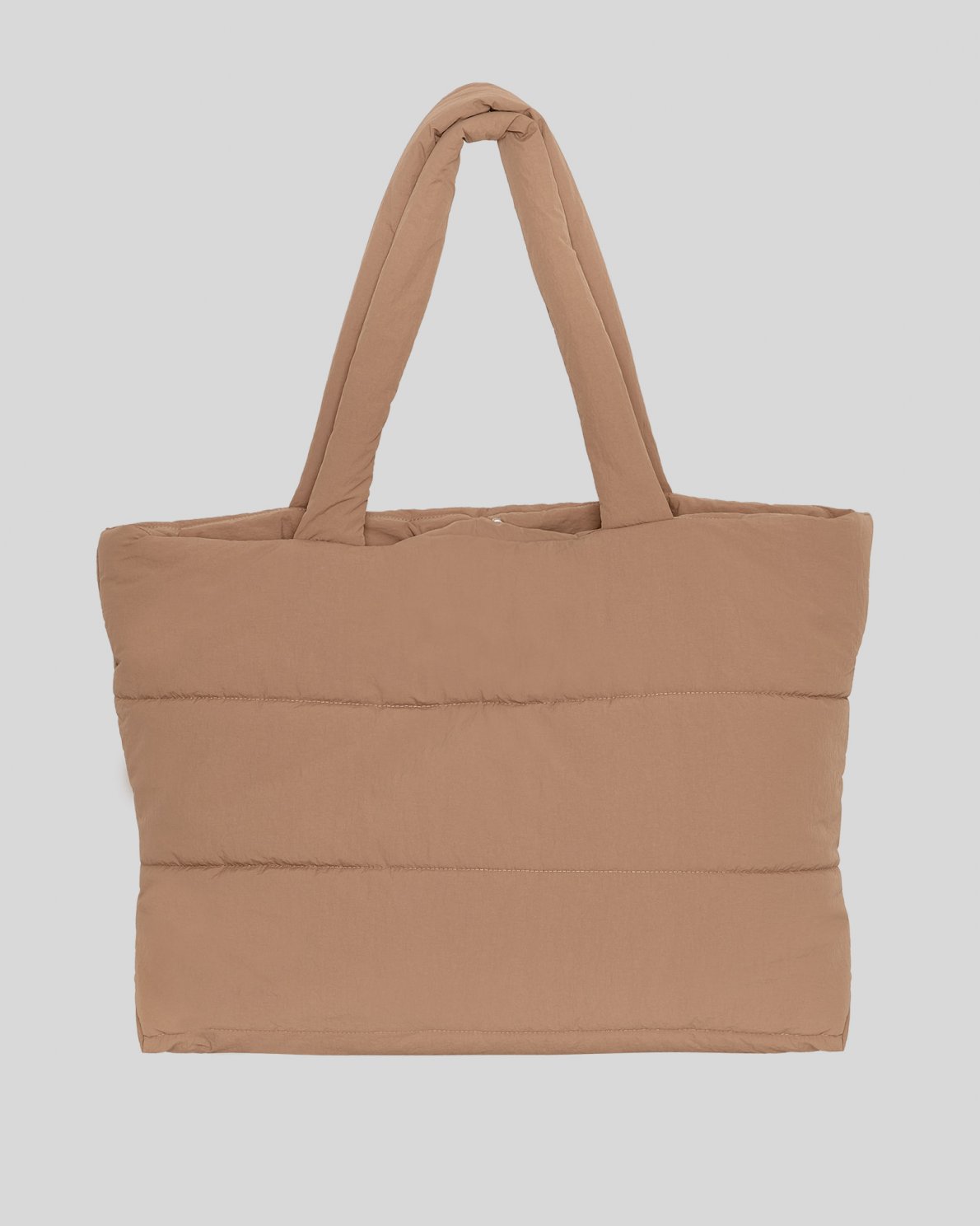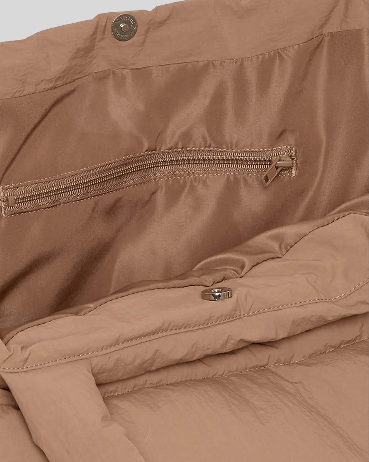Polstret shopper-taske med stort hovedrum. Tasken har brede skulderstropper, indvendig lynlåslomme og lukning med trykknap.