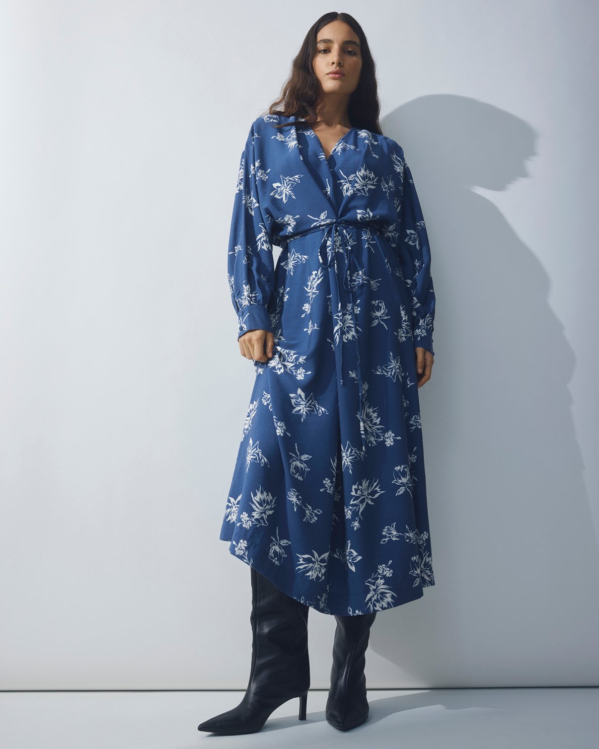 Lang kjole med all-over print. Designet med v-udskæring, gennemknapning foran og bindebånd i taljen. Lange ærmer med manchet. Let vidde i skørtet.