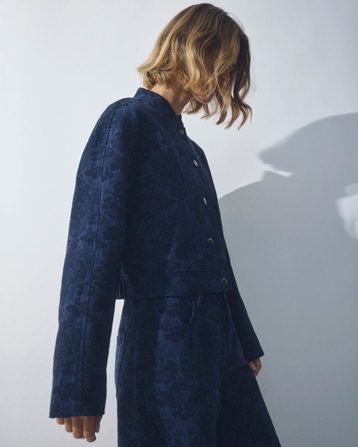 Kort jakke i vævet materiale med struktureret, mønstret overflade. Ståkrave og trykknaplukning foran. Lige ærmer og lige afslutning.