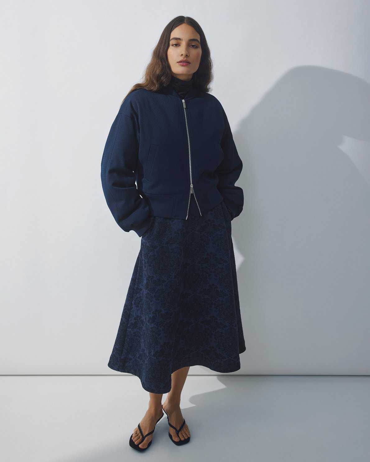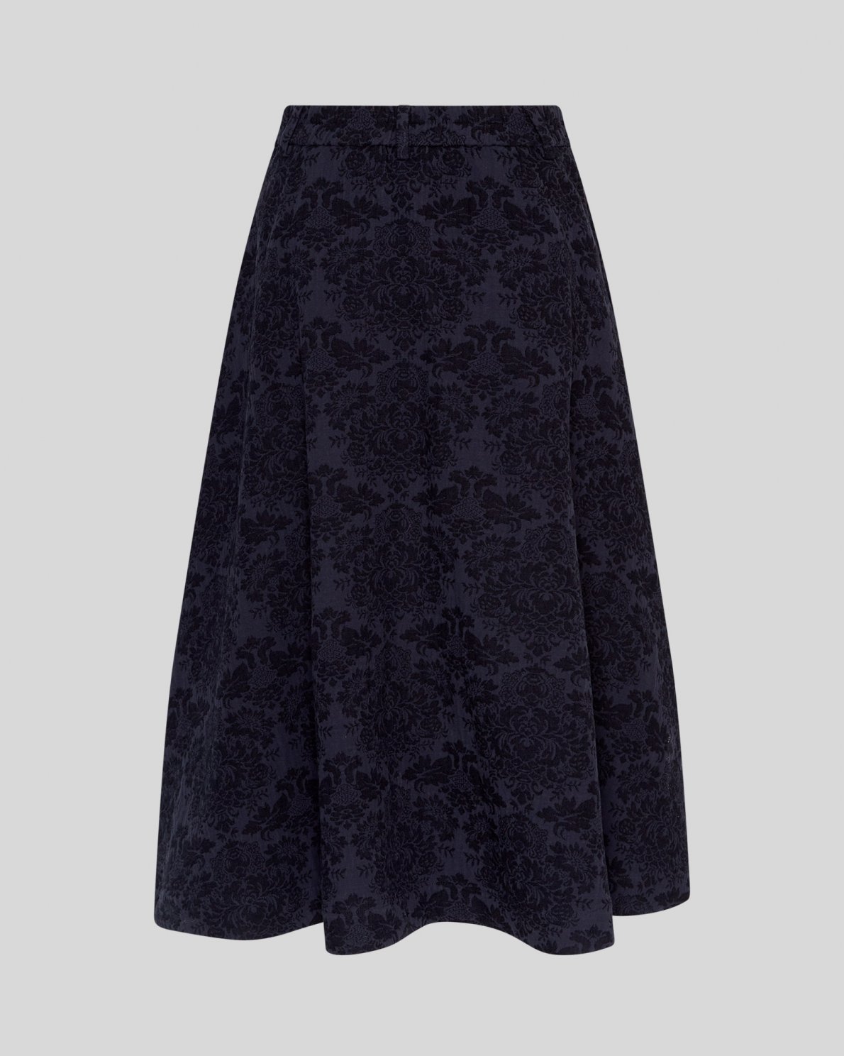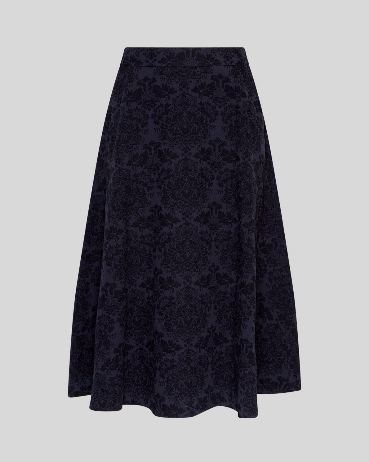Nederdel i vævet materiale med struktureret, mønstret overflade. Høj talje og vidde i skørtet, der giver en let A-form.