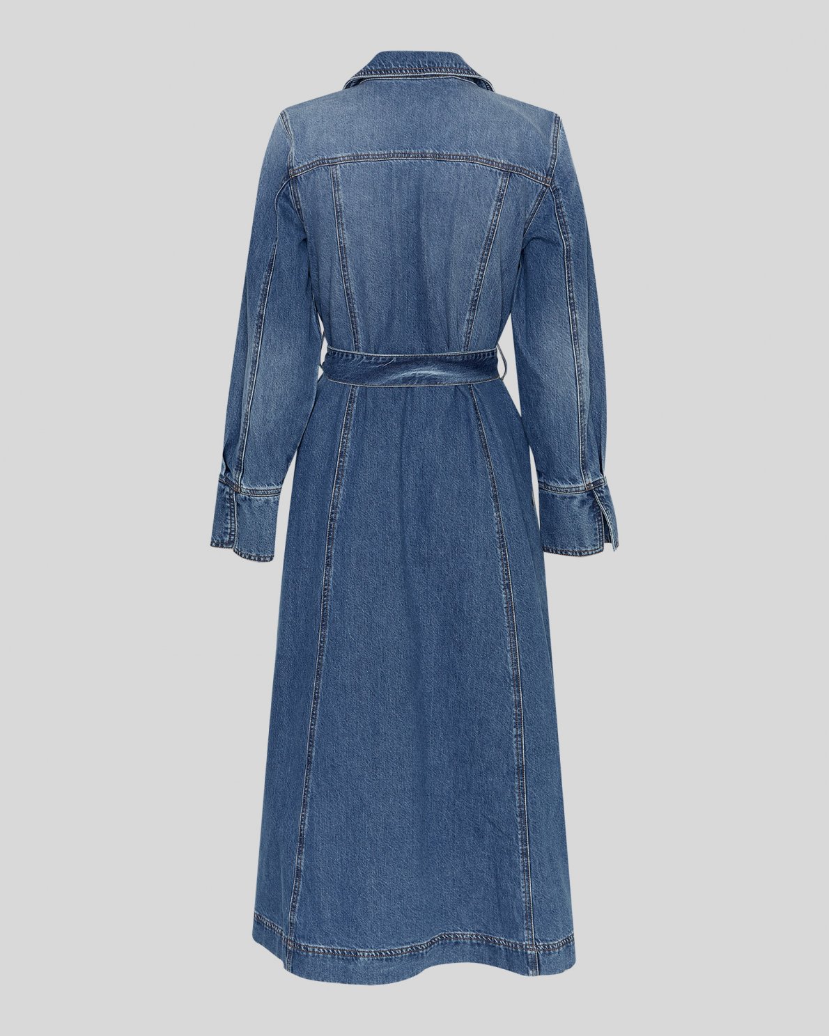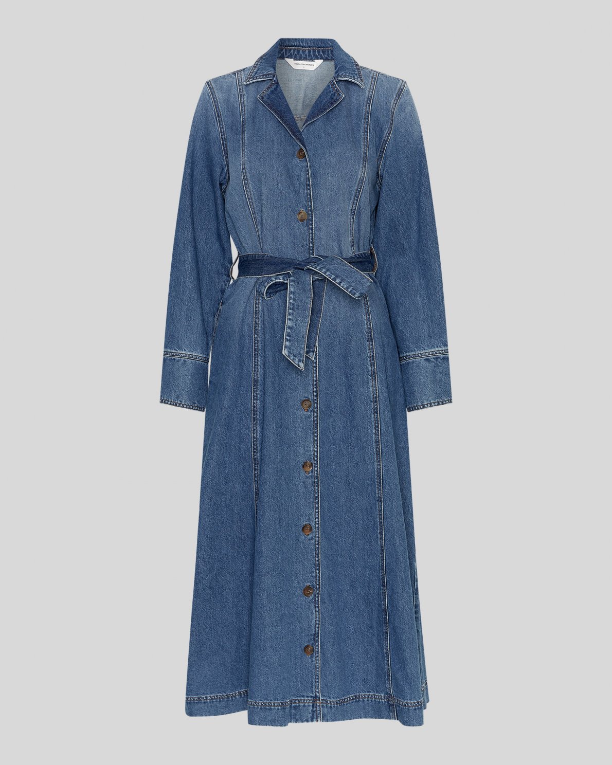 Denne lange skjortekjole i denim har et klassisk og tidløst udtryk med et feminint snit. Kjolen er designet med krave, gennemgående knaplukning og lange ærmer med manchetter. Den medfølgende bindebælte fremhæver taljen og giver mulighed for at justere pasformen. Et alsidigt denim-item, der kan styles både til hverdag og mere formelle anledninger.