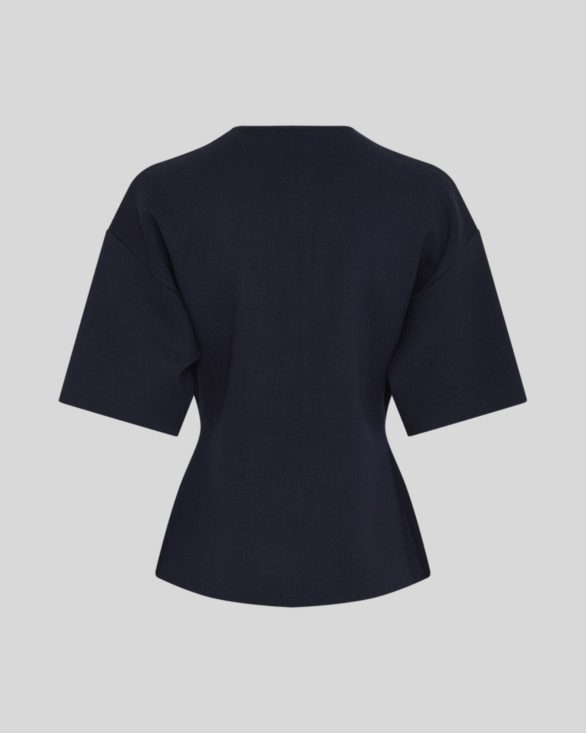 Kortærmet cardigan med figursyet silhuet og rund halsudskæring. Designet med gennemgående knaplukning foran og ribstrikket struktur. Tætsiddende pasform, der fremhæver kroppens linjer.