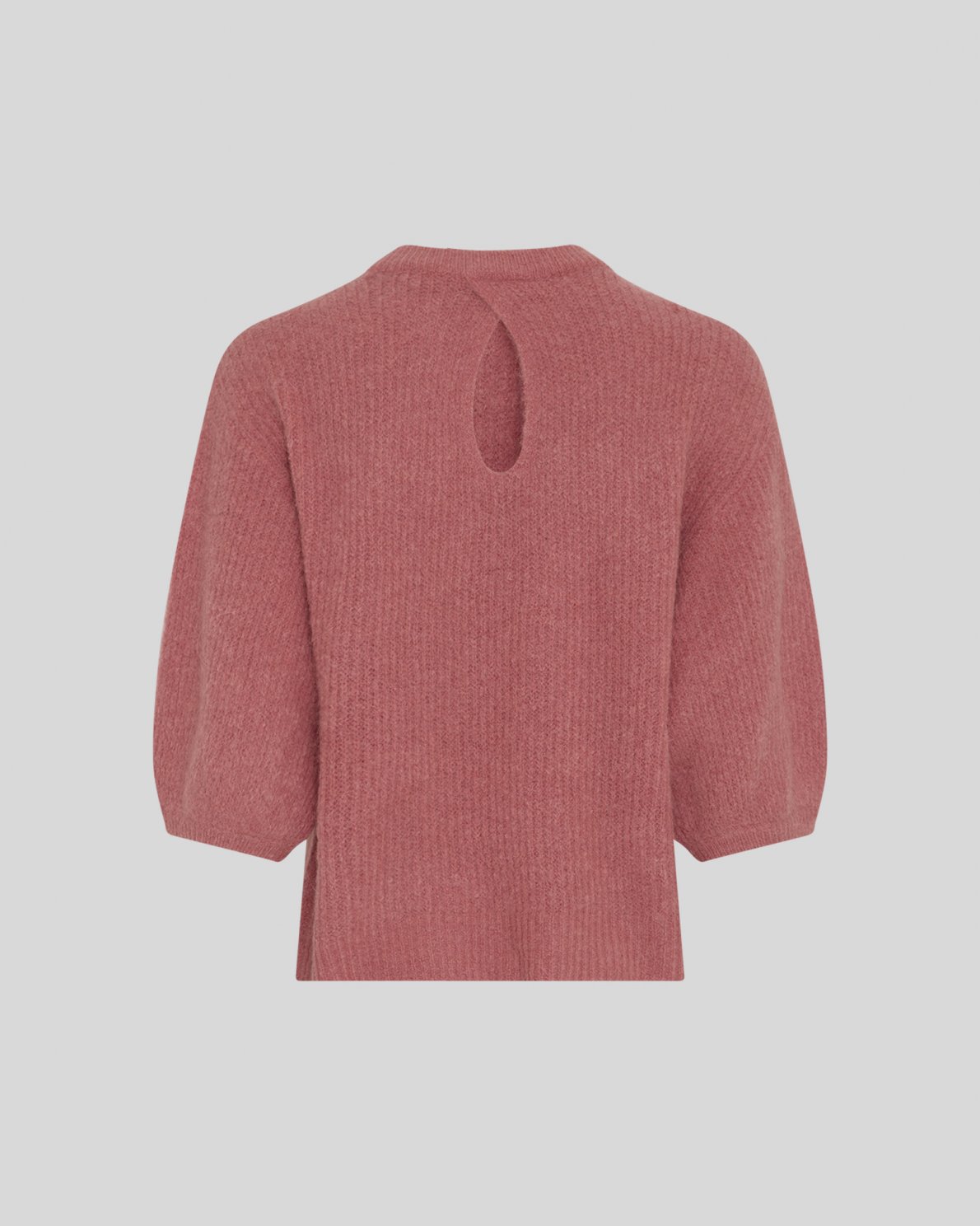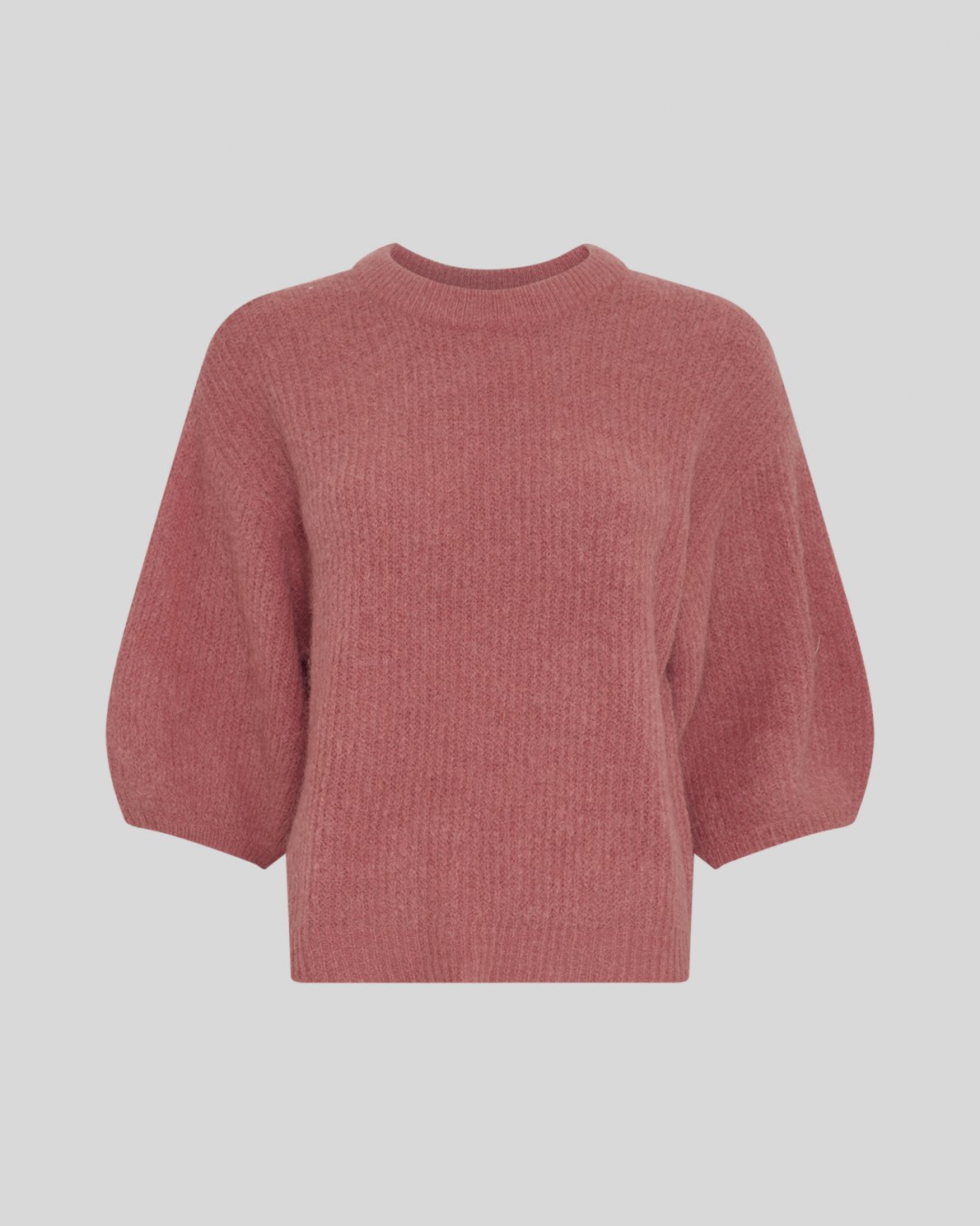 Strikket pullover med rund hals og 2/4 ærmer. Sænkede skuldre og nøglehulsåbning i nakken. Ribstrikket kvalitet og almindelig pasform.