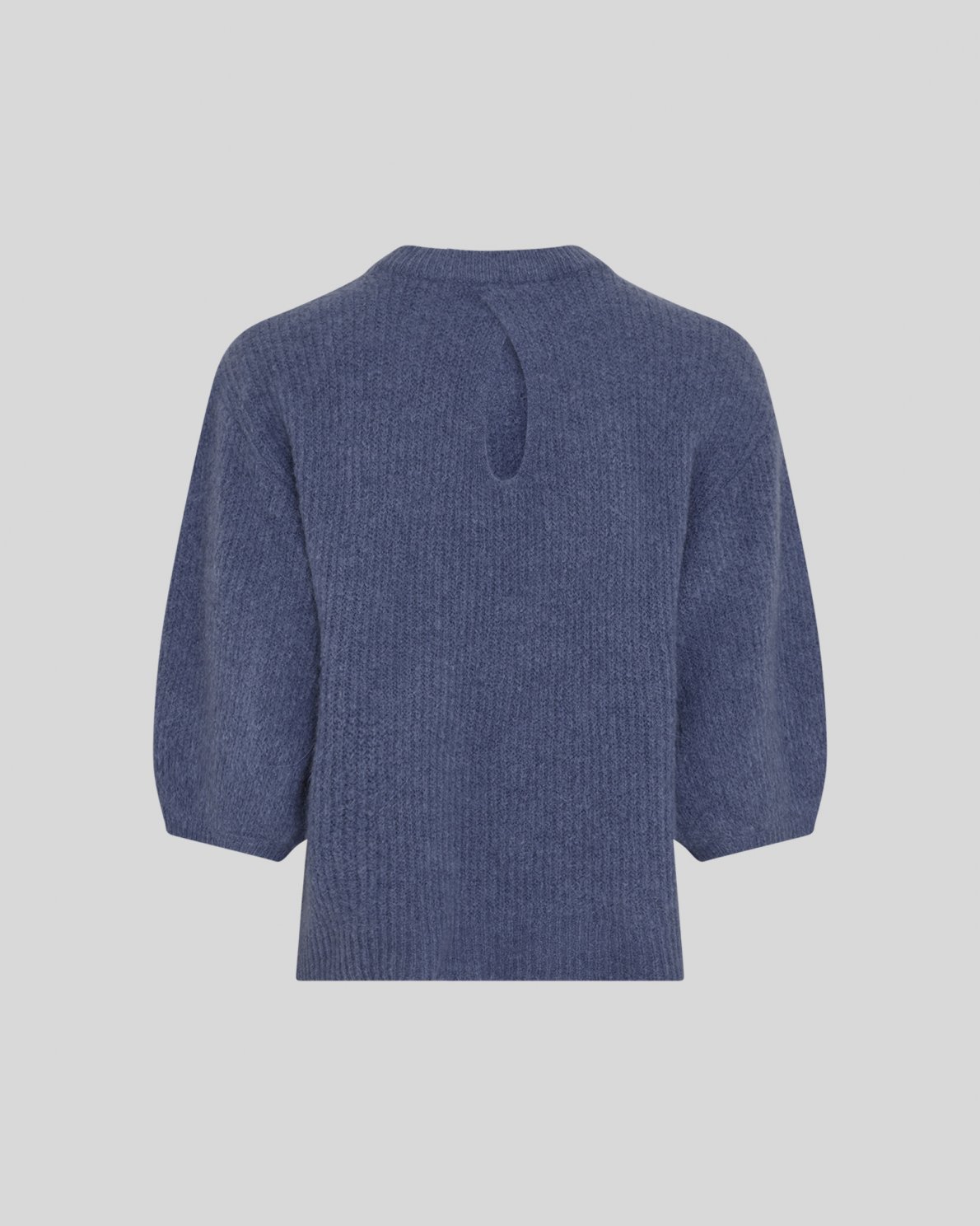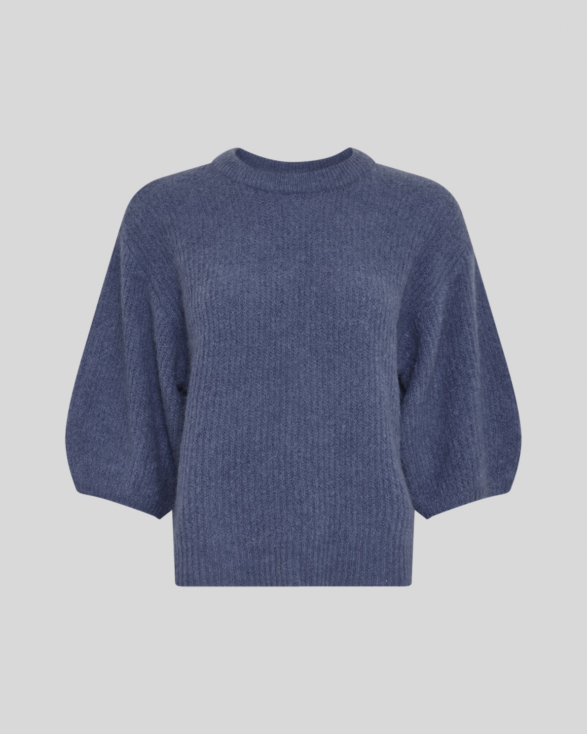 Strikket pullover med rund hals og 2/4 ærmer. Sænkede skuldre og nøglehulsåbning i nakken. Ribstrikket kvalitet og almindelig pasform.