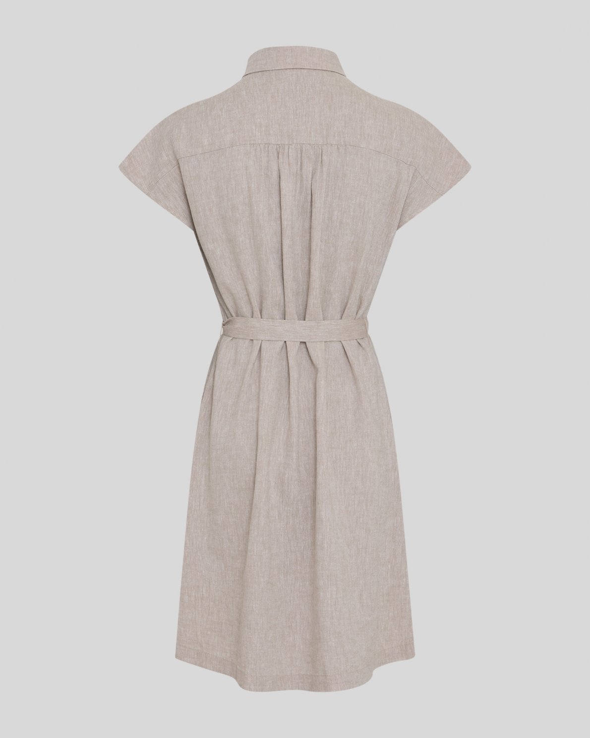 Skjortekjole i hørblanding med gennemgående knaplukning foran. Aftageligt bindebånd i taljen. Korte ærmer. Lige silhuet.