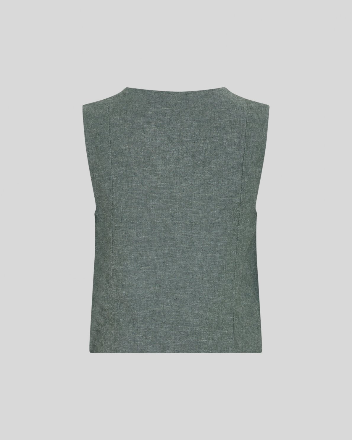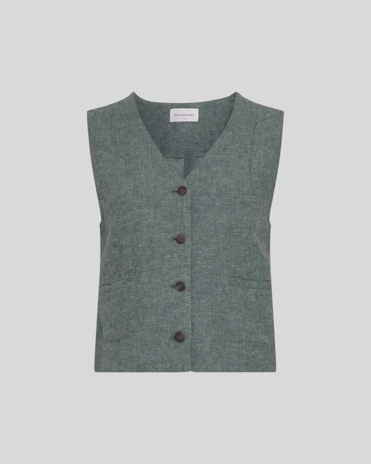 Ærmeløs vest i hørblanding. Designet med en let løs pasform og V-udskæring. Lukkes med knapper foran og har to dekorative forlommer. Fuldt foret konstruktion.