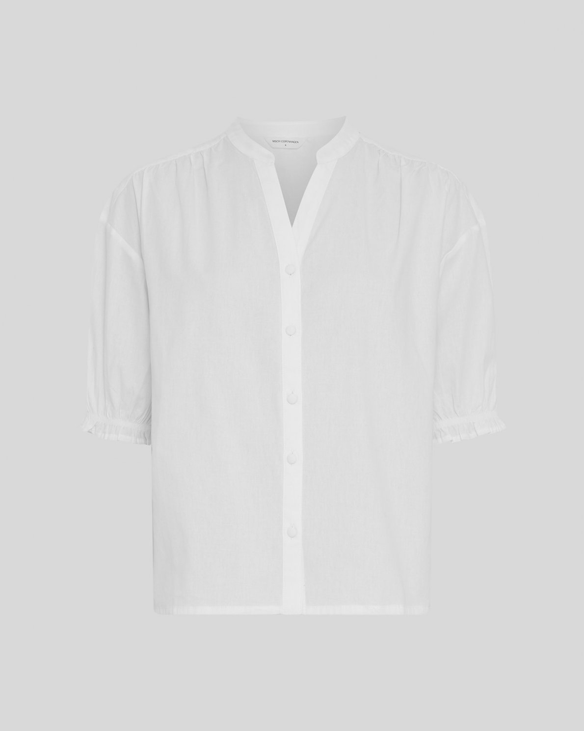 Kortærmet skjorte i let vævet bomuldskvalitet. Designet med kinakrave og gennemgående knaplukning foran. Let rynk ved skuldre og bagstykke. Ærmer med elastisk kant og lille knapdetalje. Lige silhuet med let volumen.
