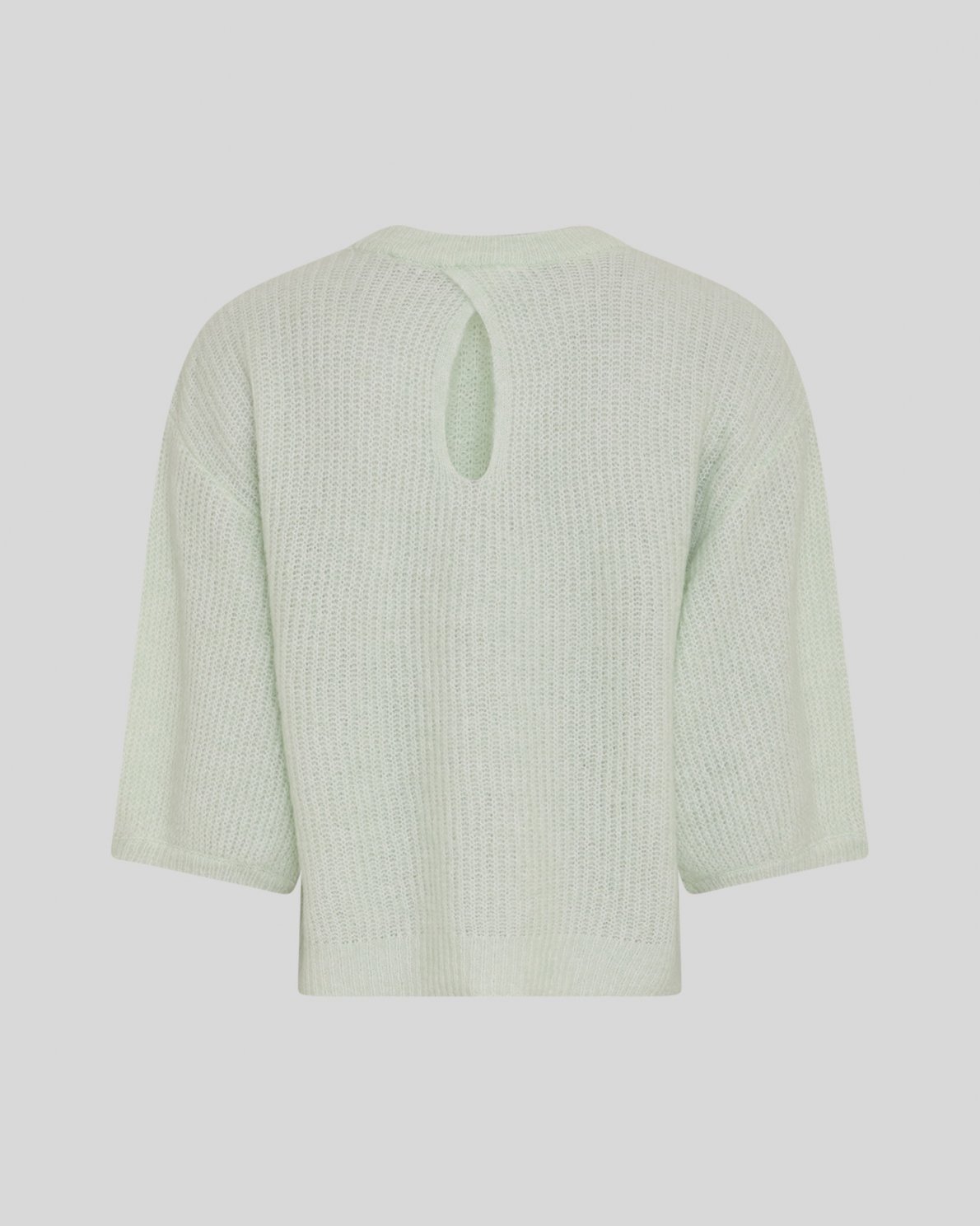 Strikket pullover med rund hals og 2/4 ærmer. Sænkede skuldre og nøglehulsåbning i nakken. Ribstrikket kvalitet og almindelig pasform.