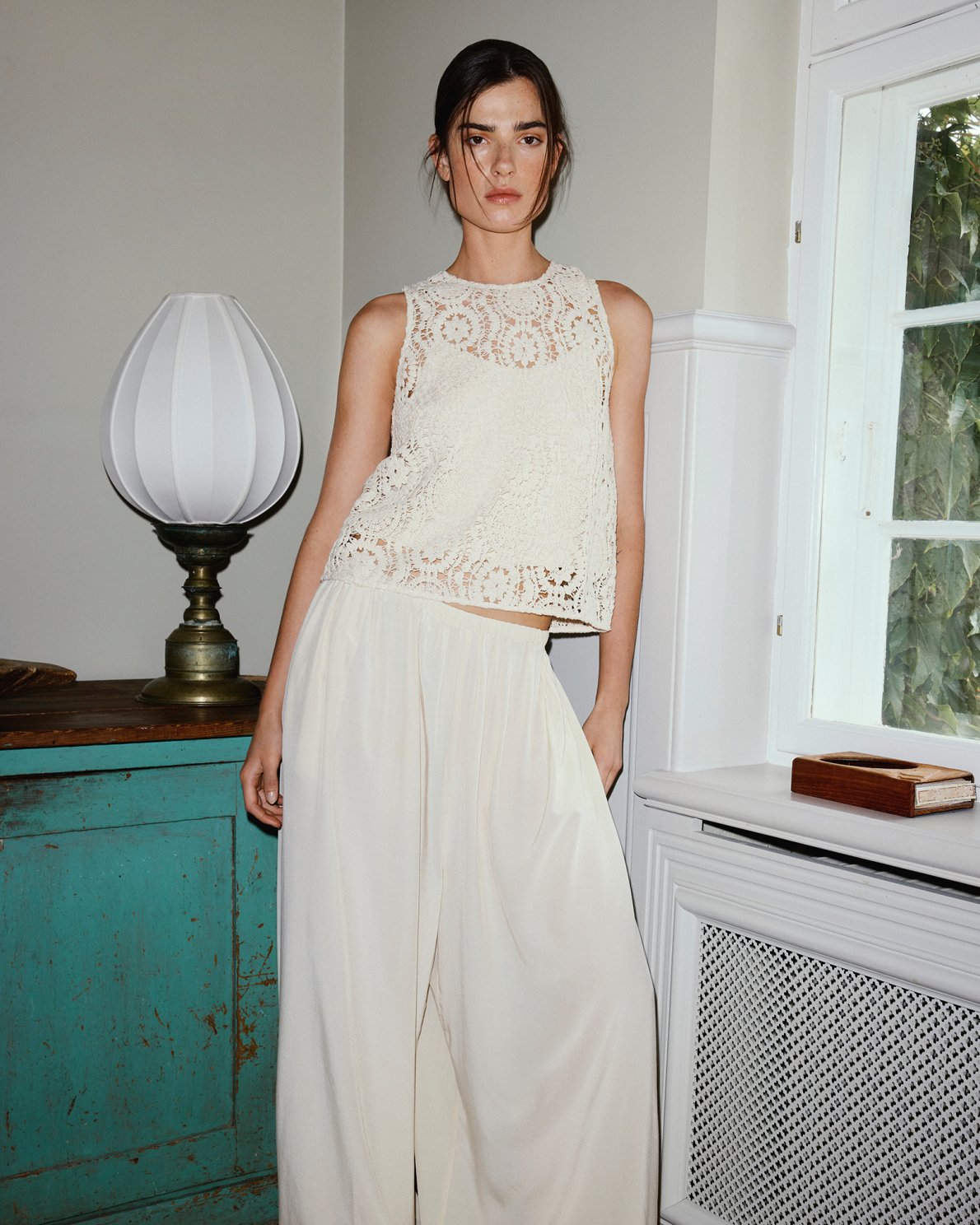 Løse bukser i let vævet kvalitet. Designet med elastisk talje og bred pasform. Ankellange ben med elastisk afslutning. Blød og let struktur i materialet.