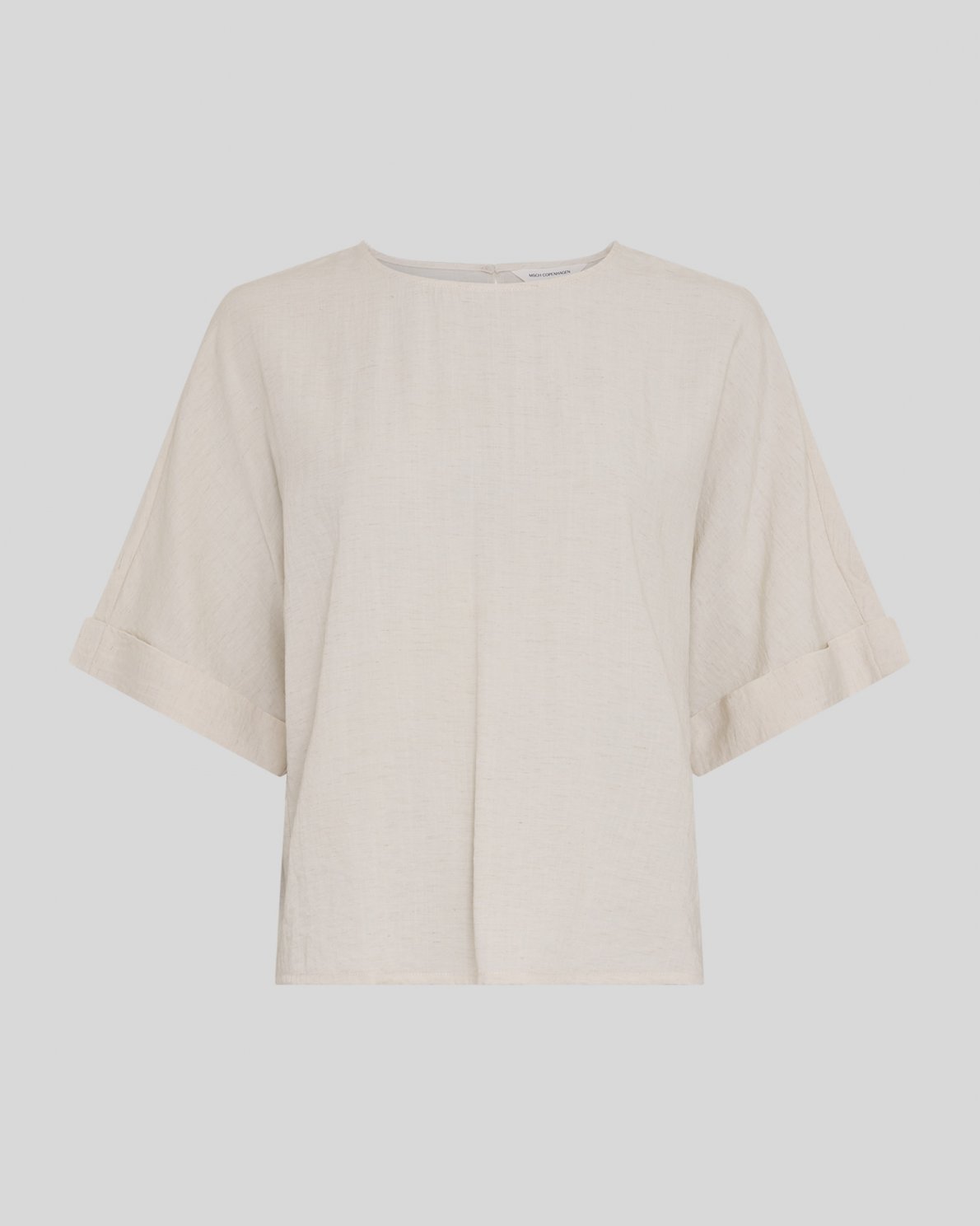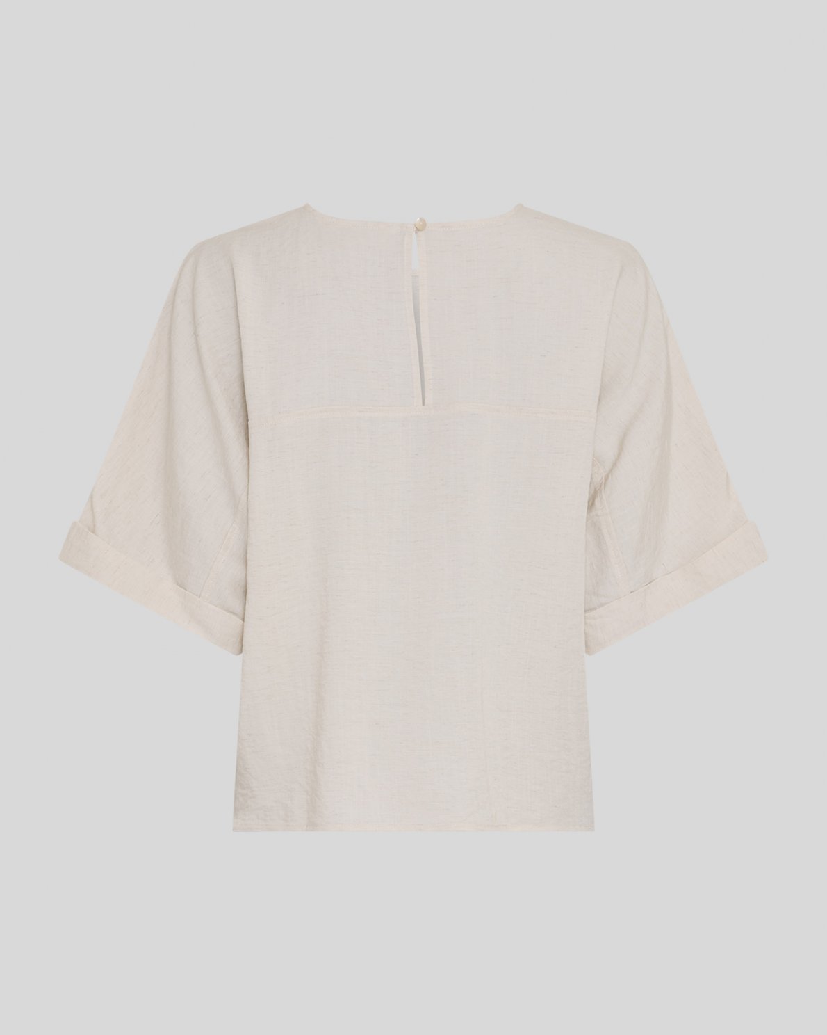 Kortærmet top i let vævet kvalitet. Designet med rund hals og knaplukning i nakken. Løs silhuet med brede ærmer og opsmøgede kanter. Let og blød struktur i materialet.