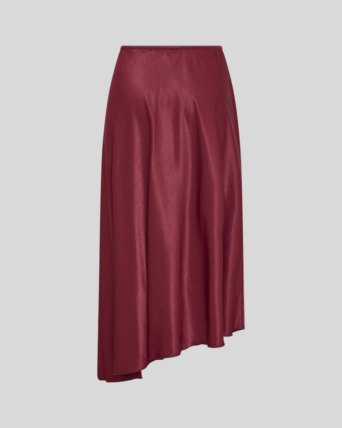 Lang nederdel i glat kvalitet med let skinnende overflade. Designet med asymmetrisk kant og flydende fald. Elastisk talje for fleksibel pasform. Let A-formet silhuet.