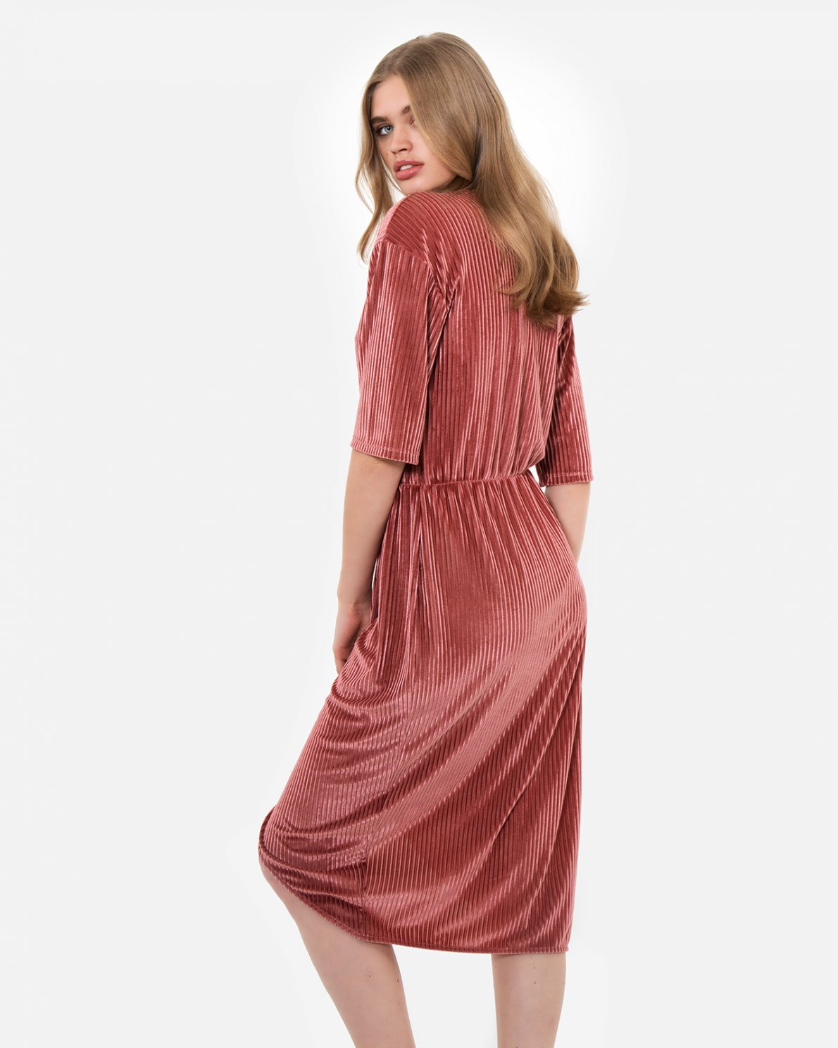 Velvet dress with elastic waist, slit at the the bottom and a v-neck wrap detail